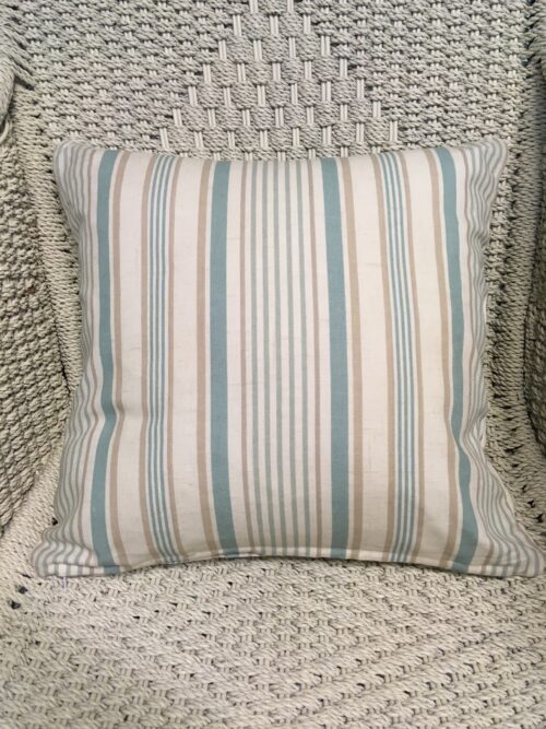 40cm x 40cm scatter cushion cover with zipper opening in bottom seam of cushion. Cotton fabric with linen background and aqua & taupe vertical stripes.