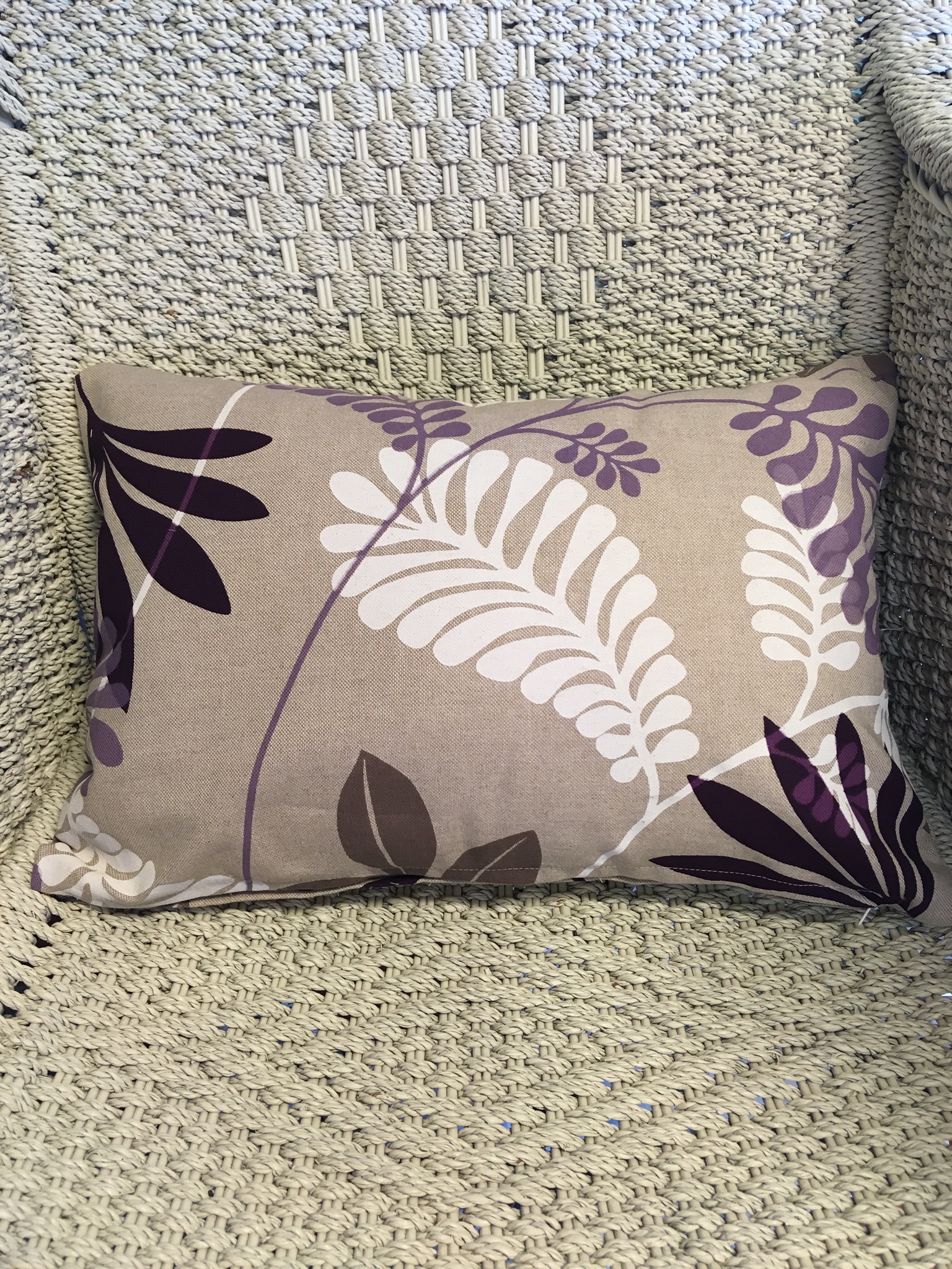 45cm x 30cm scatter cushion cover with zipper opening in bottom seam of cushion. Beige linen blend fabric with purple, white, black & brown leaf design.