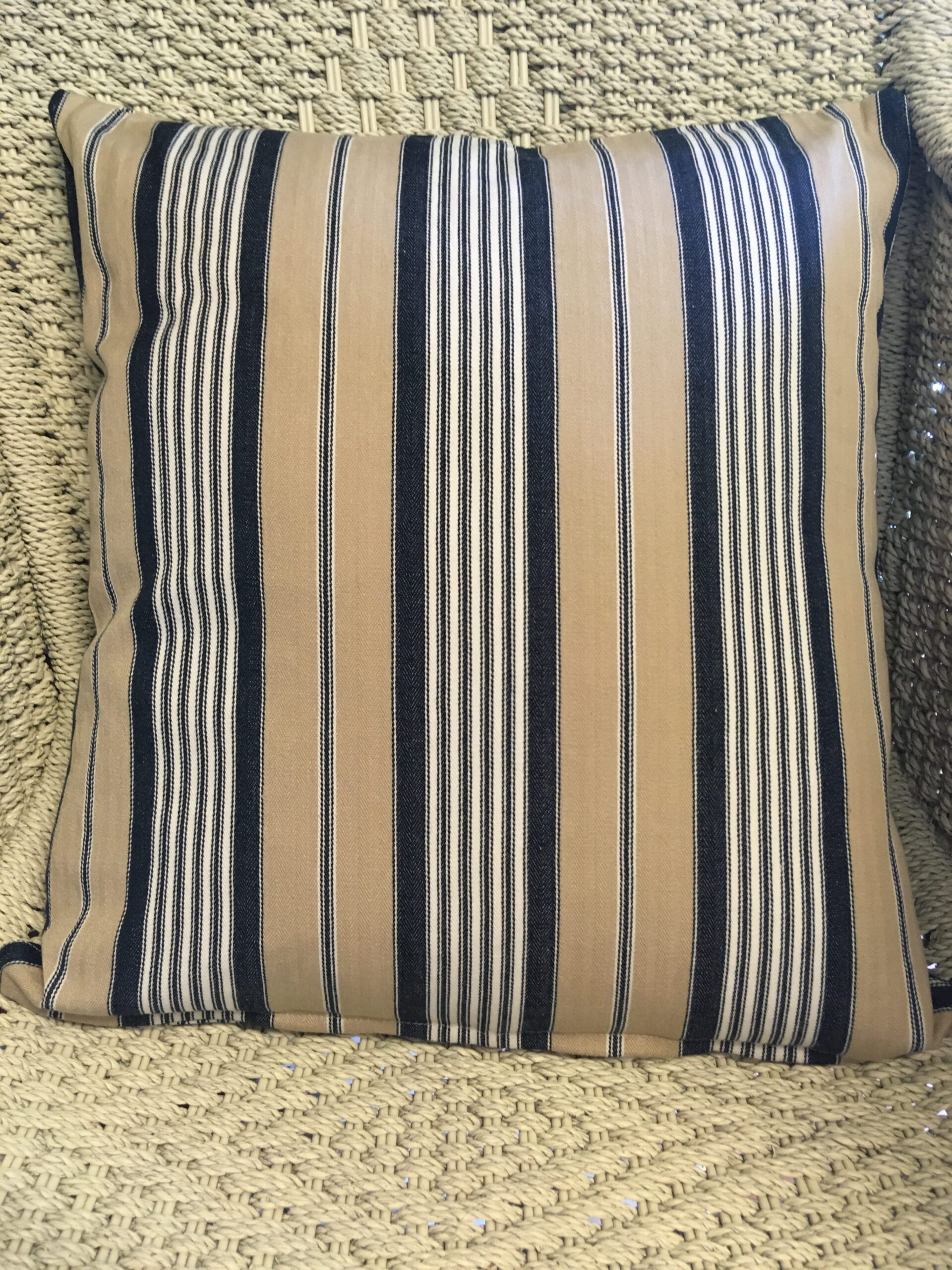 45cm x 45cm scatter cushion cover with zipper opening in bottom seam of cushion. Canvas fabric with beige, white & navy blue vertical stripes.