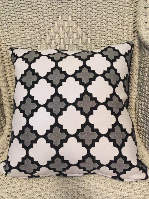 40cm x 40cm scatter cushion cover with zipper opening in bottom seam of cushion. Canvas fabric with black, white & grey cross design on front of cushion with plain black fabric on back of cushion.