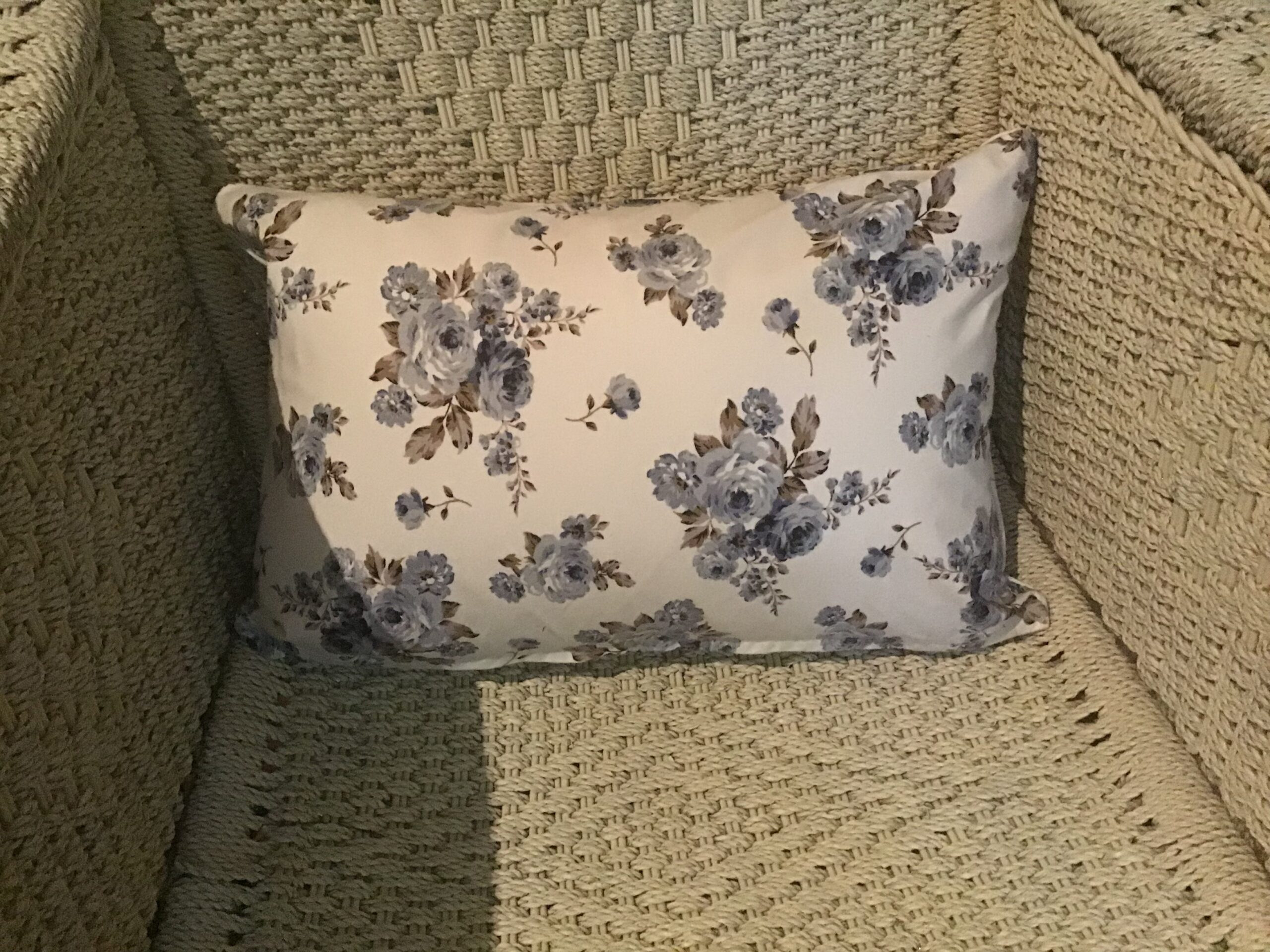 45cm x 30cm scatter cushion cover with zipper opening in bottom seam of cushion. Cotton blend fabric with blue and chocolate rose design.