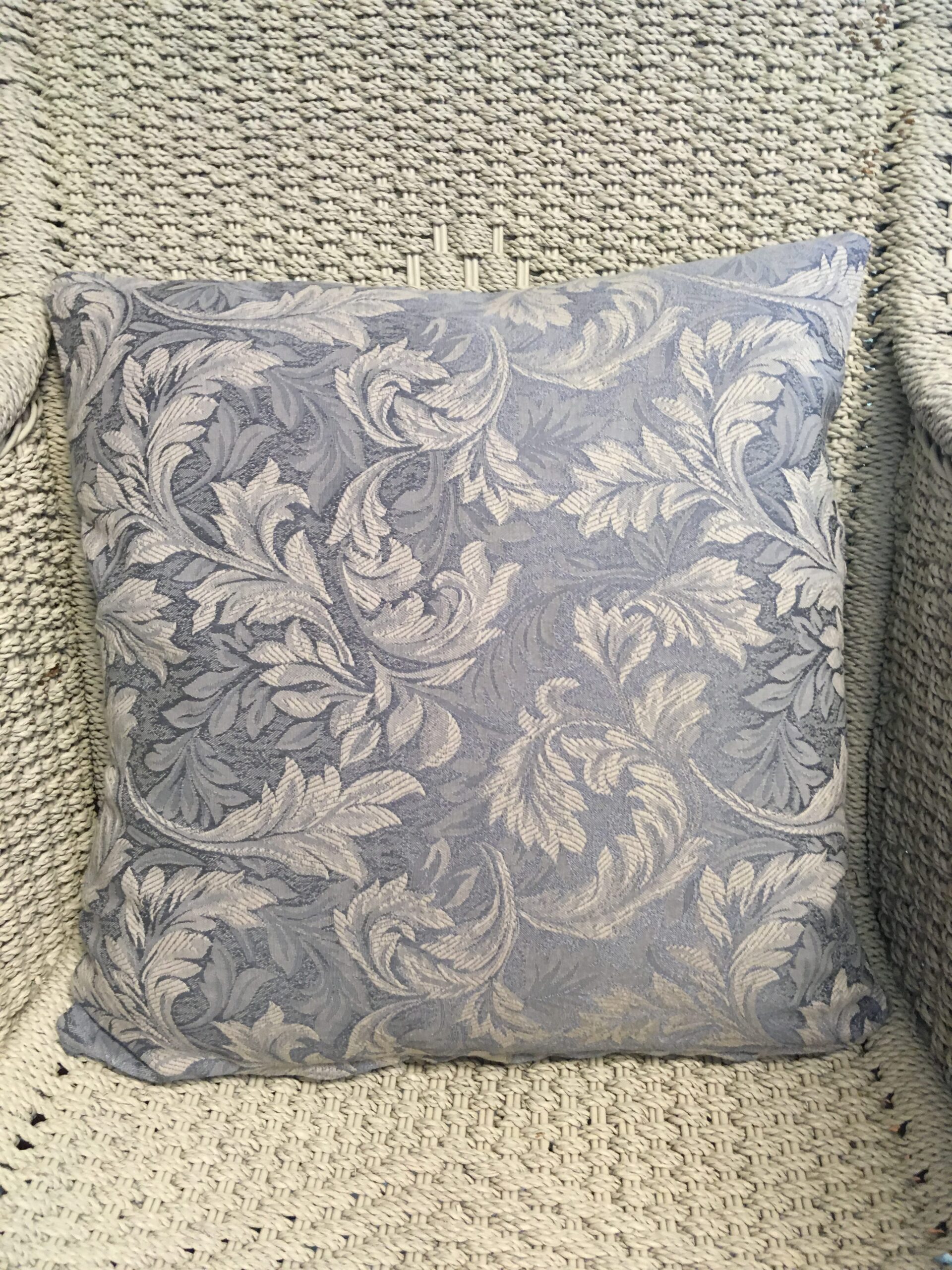45cm x 45cm scatter cushion with zipper opening in bottom seam of cushion. Blue fabric with leaf self print design.