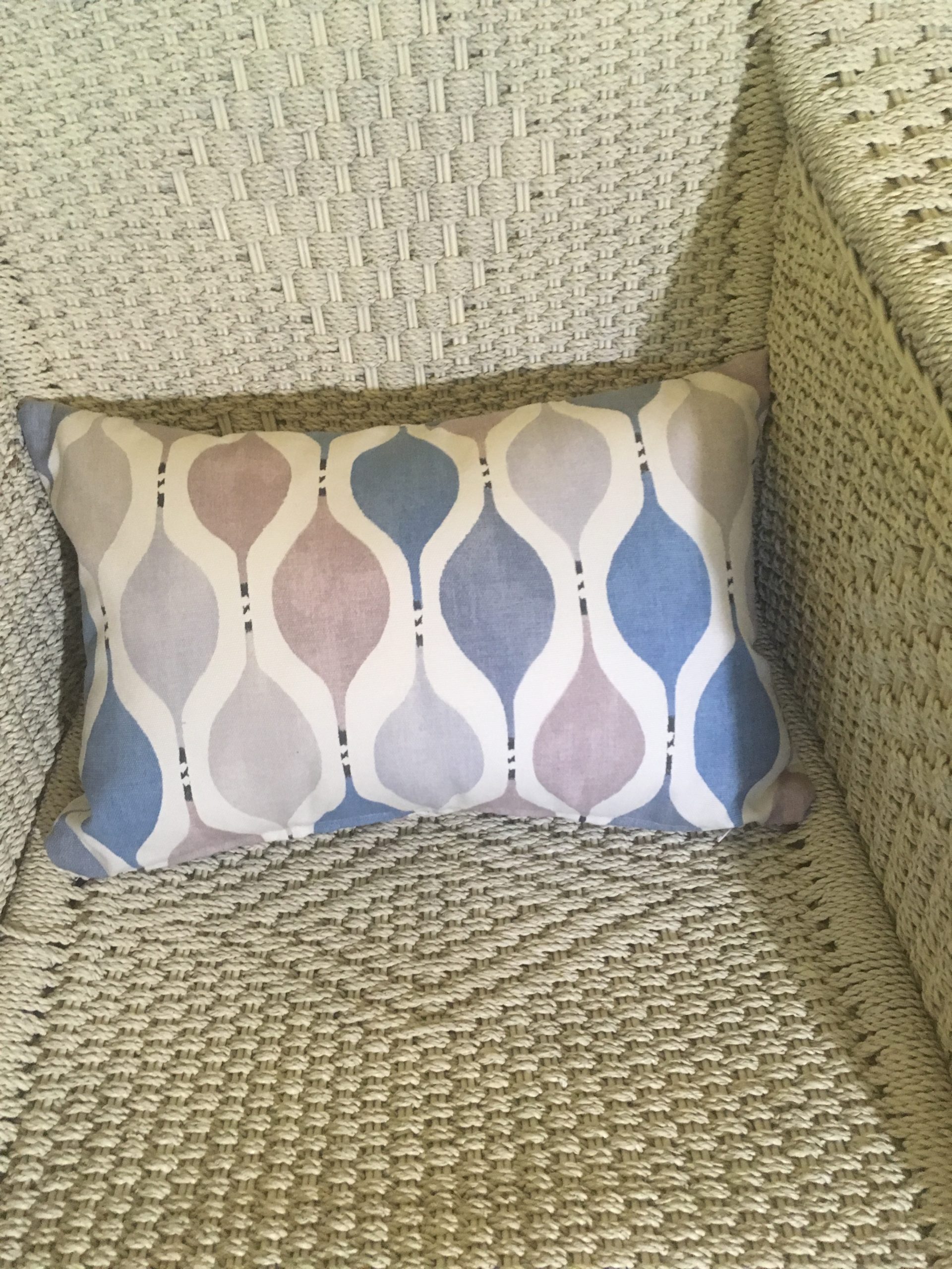 45cm x 30cm scatter cushion cover with zipper opening in bottom seam of cushion. Canvas fabric with off white background and blue, silver & taupe raindrop design.