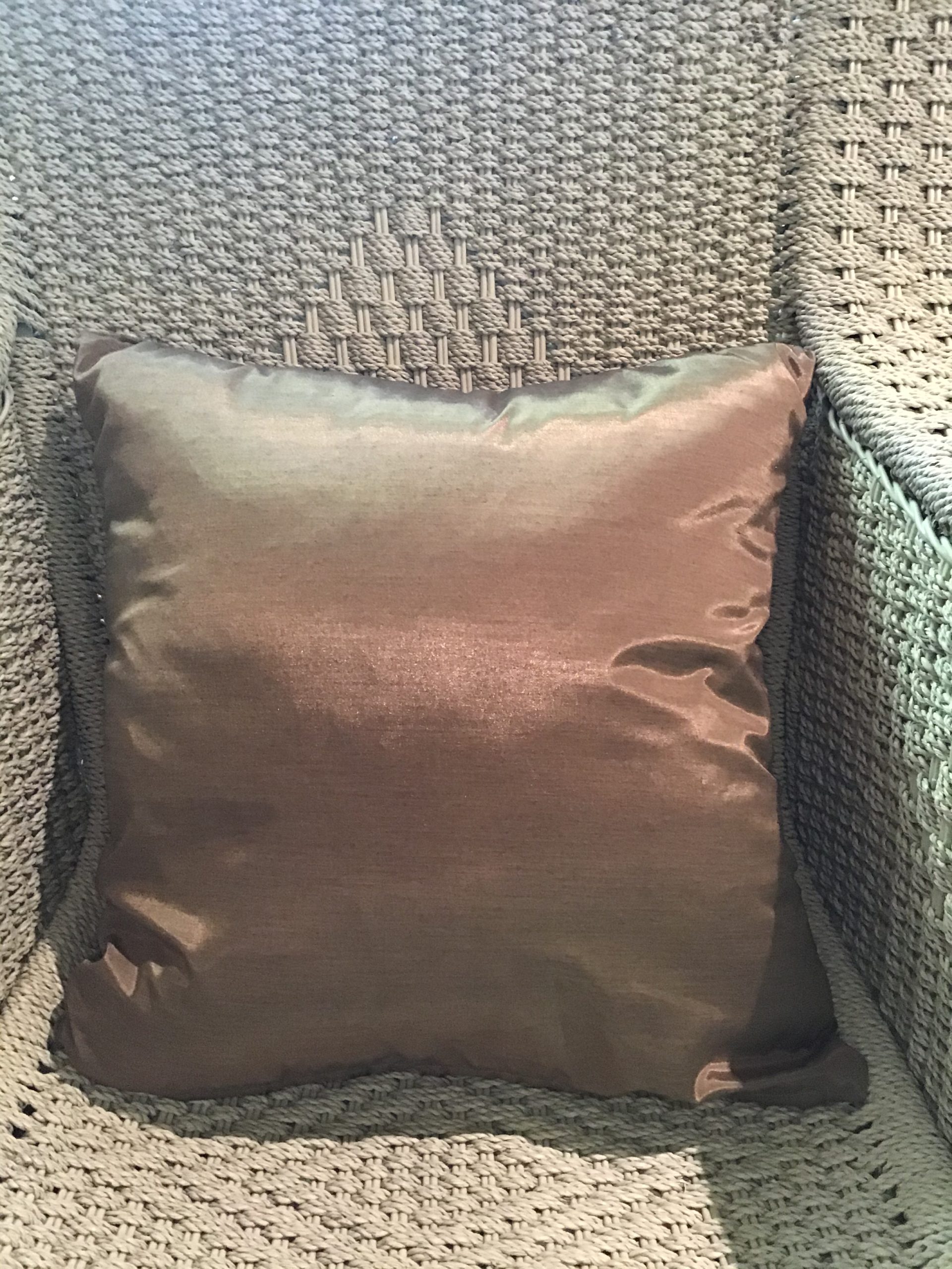 45cm x 45cm scatter cushion cover with zipper opening in bottom seam of cushion. Polyester blend fabric that looks like silk in bronze colour.