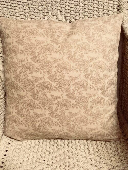 45cm x 45cm scatter cushion cover with zipper opening in the bottom seam of cushion. Linen fabric with brown floral print.
