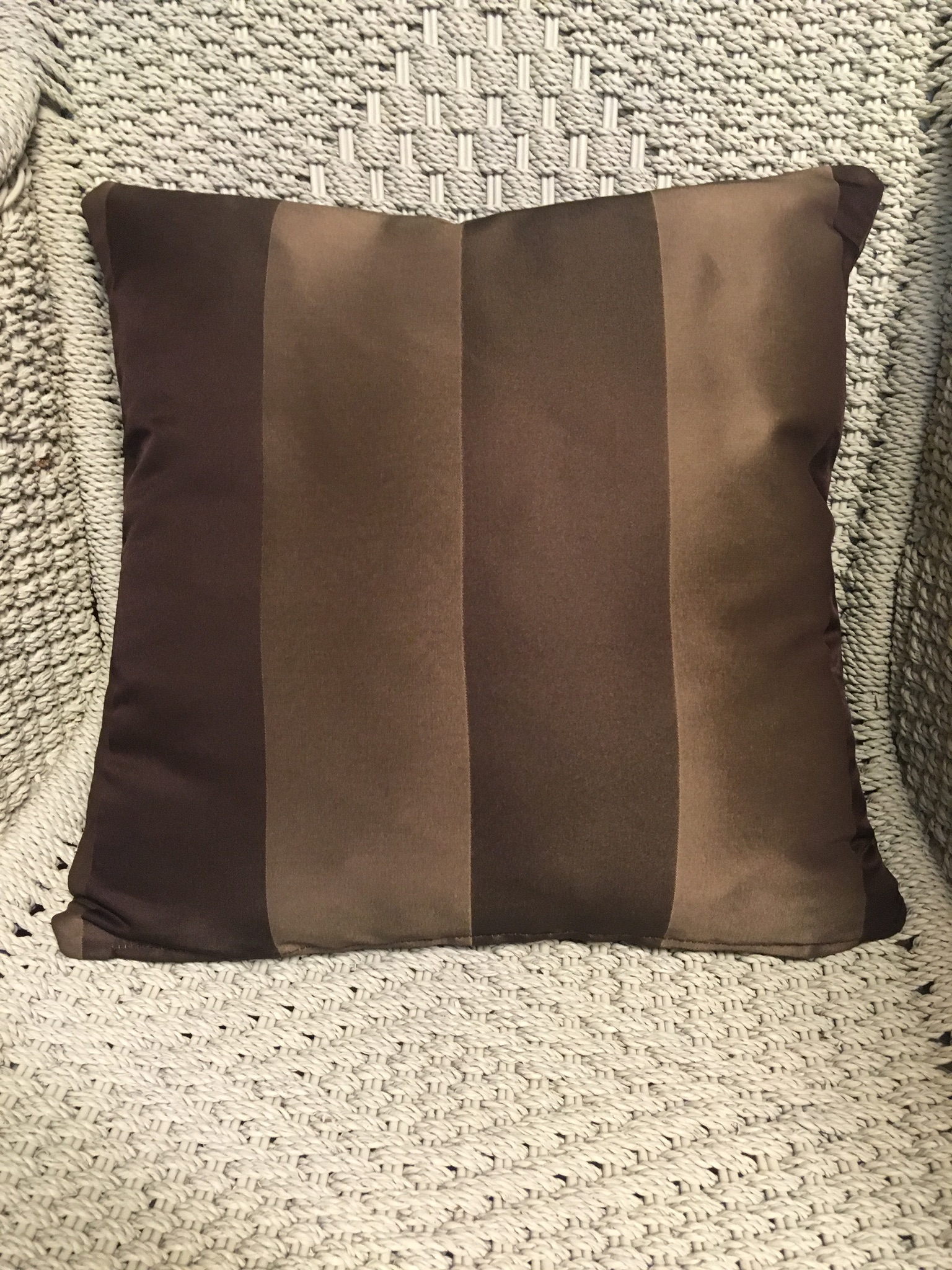 40cm x 40cm scatter cushion cover with zipper opening in bottom seam of cushion. Polyester blend fabric with two-tone brown Vertical Stripe.