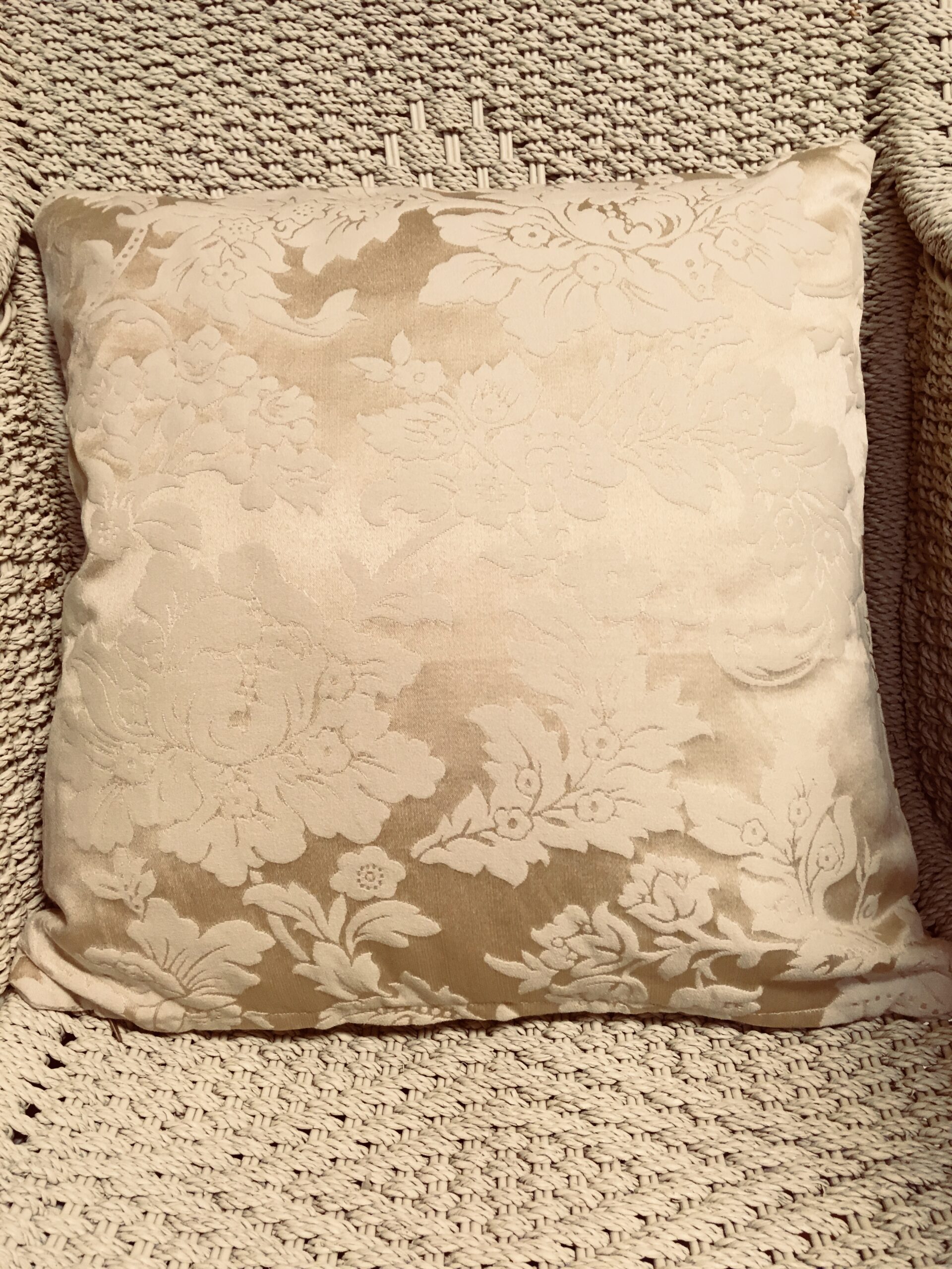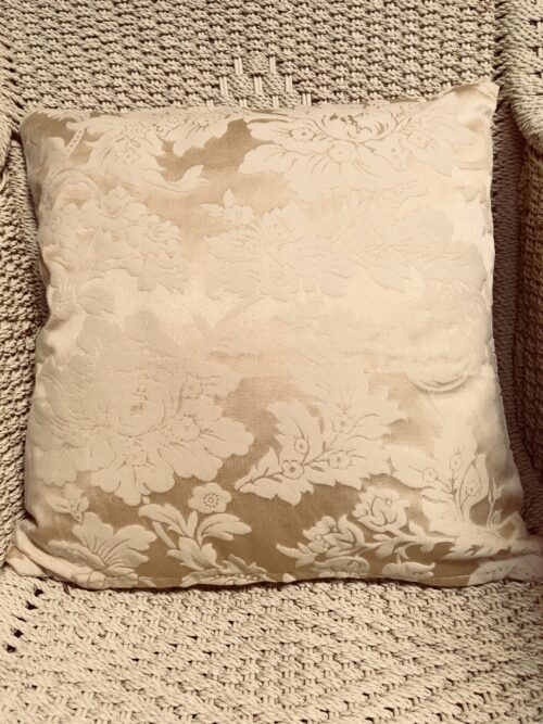 45cm x 45cm scatter cushion cover with zipper opening in bottom seam of cushion. Cream fabric with shiny background with matt floral self print