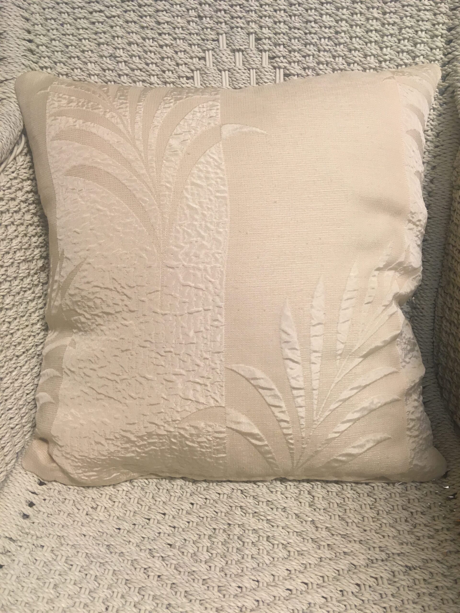 45cm x 45cm scatter cushion with zipper opening in bottom seam of cushion. Cream fabric with textured leaf self print on one side of cushion and textured wavy vertical stripes self print on the other side.