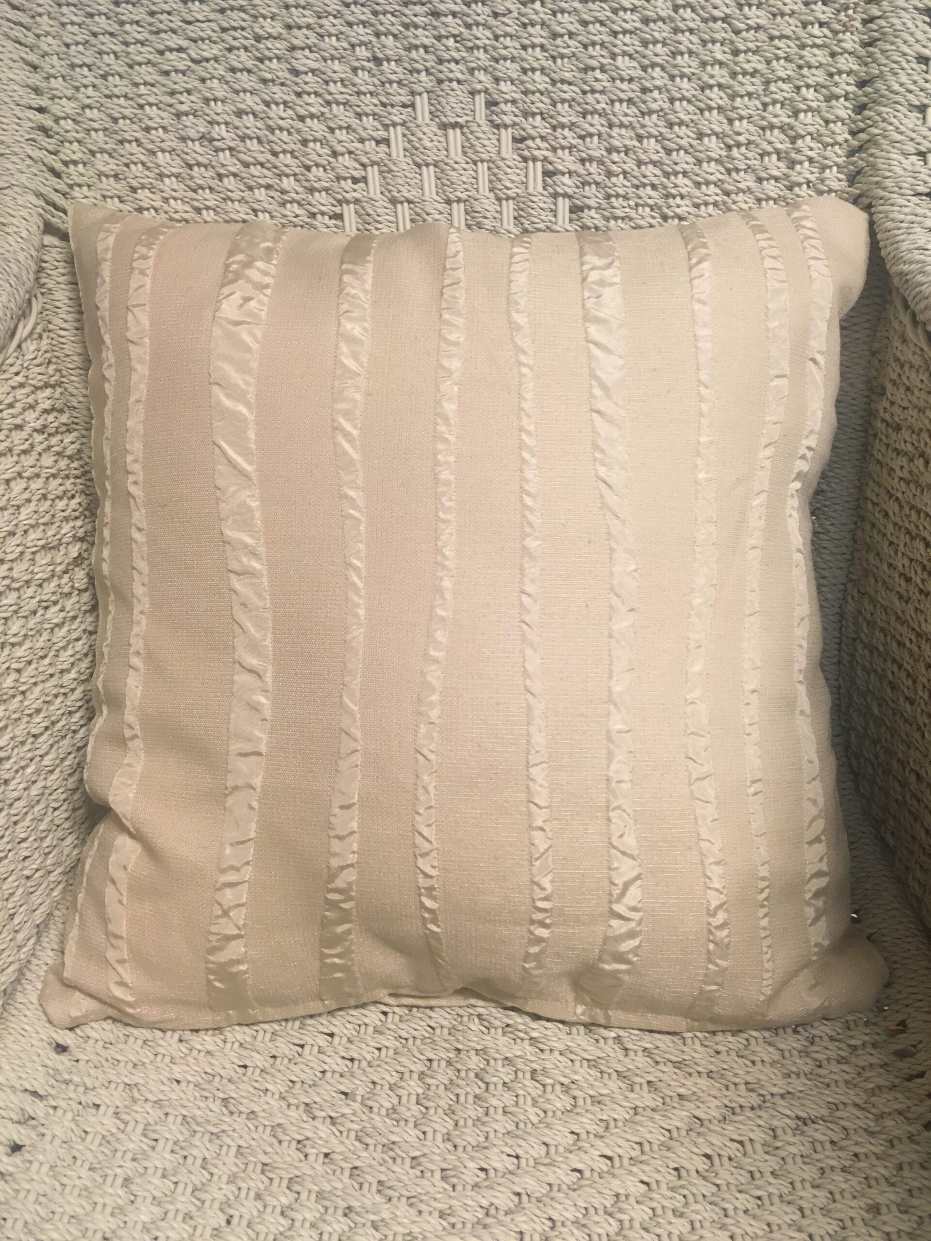45cm x 45cm scatter cushion cover with zipper opening in bottom seam of cushion. Cream fabric with textured wavy vertical stripe self print design.