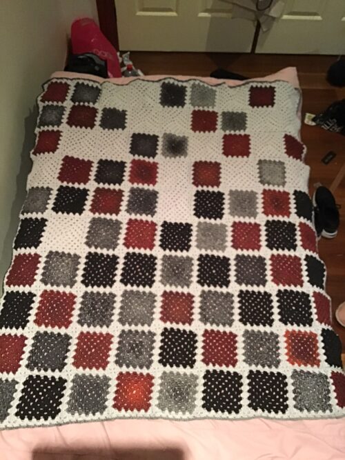 Crocheted Blanket – Grey, Charcoal and Burgundy