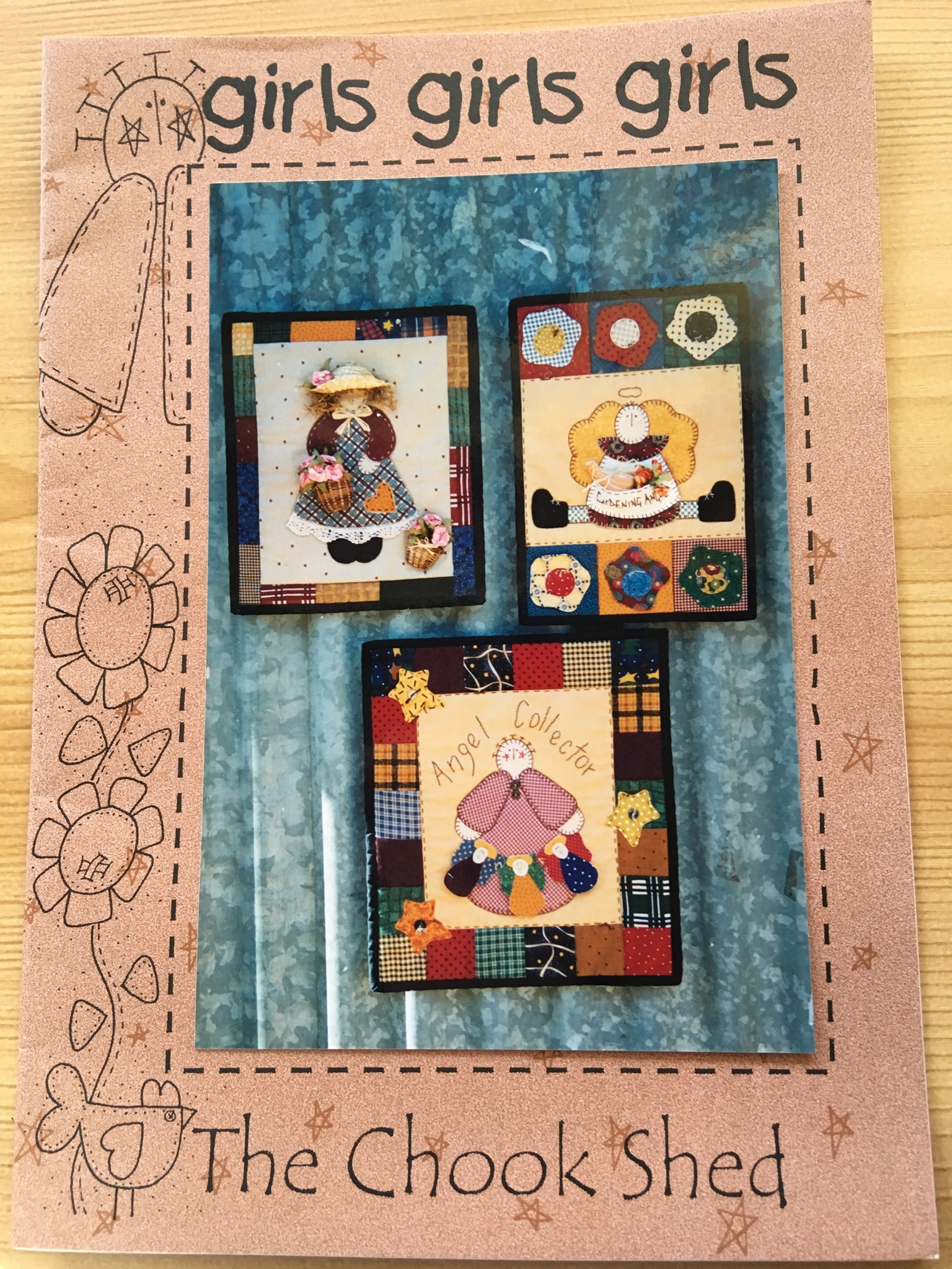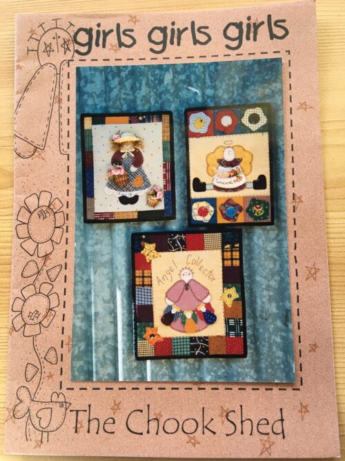 Designed by The Chook Shed. Pattern includes Gardening Angel wallhanging (24cm x 33cm), Angel Collector wallhanging (31cm x 36cm) and Flower Girl wallhanging (26cm x 31cm).