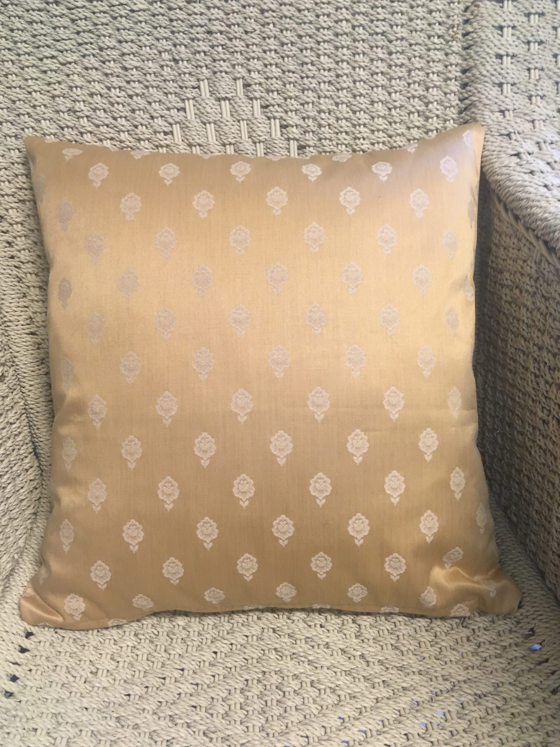 40cm x 40cm scatter cushion cover with zipper opening in bottom seam of cushion. Cotton blend fabric with gold background and cream medallion design.