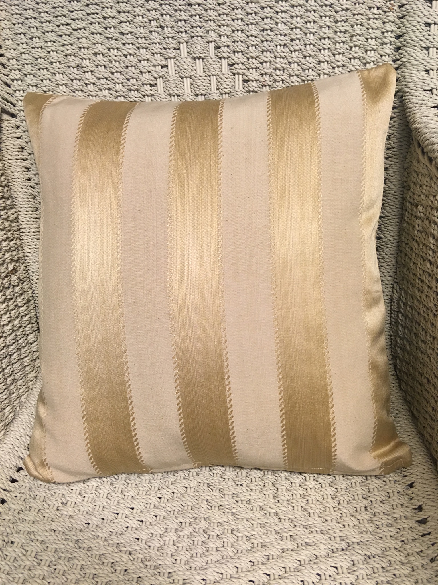 40cm x 40cm scatter cushion cover with zipper opening in bottom seam of cushion. Cotton blend fabric with Matt and shiny gold vertical stripes.