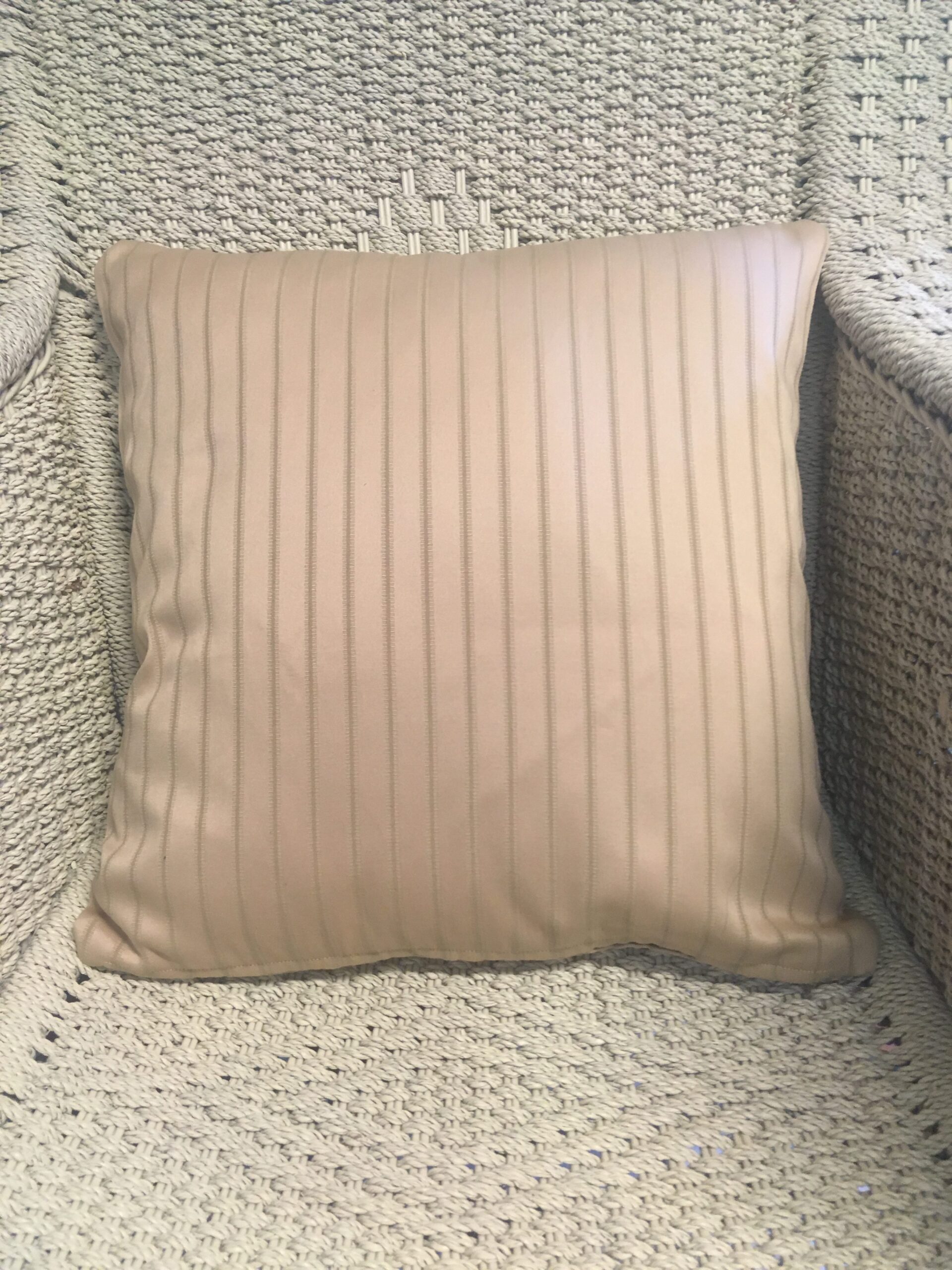 45cm x 45cm scatter cushion cover with zipper opening in bottom seam of cushion. Cotton blend fabric with gold background & thin darker gold vertical stripes.