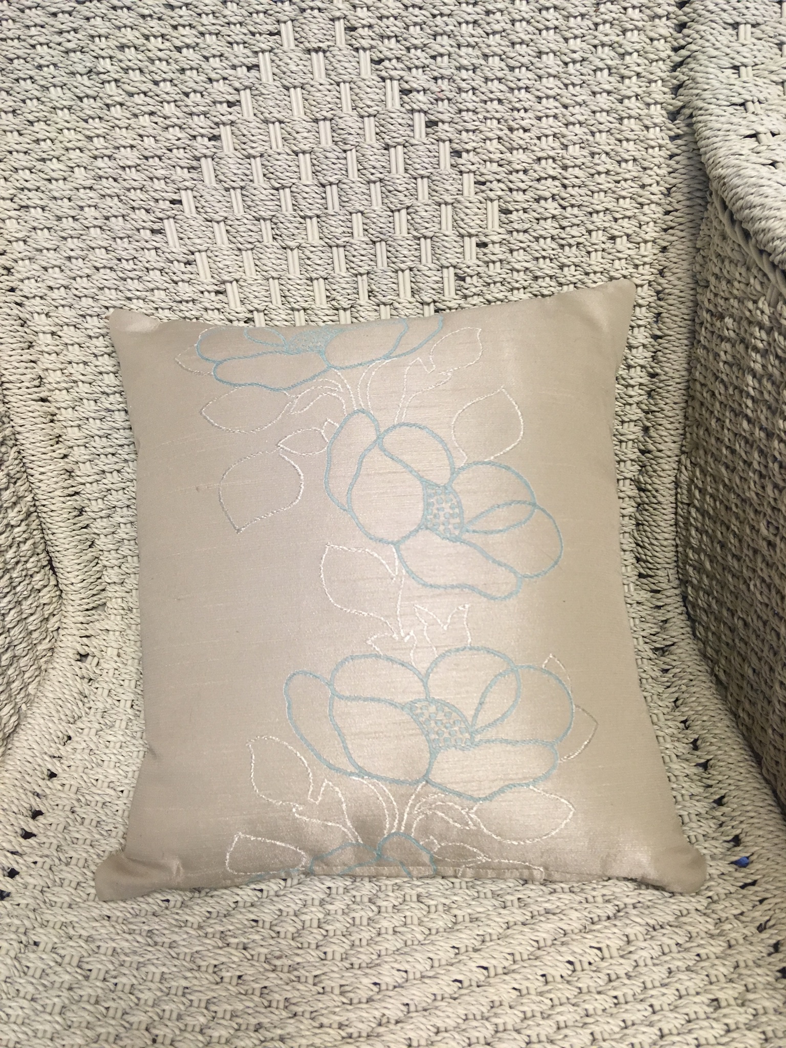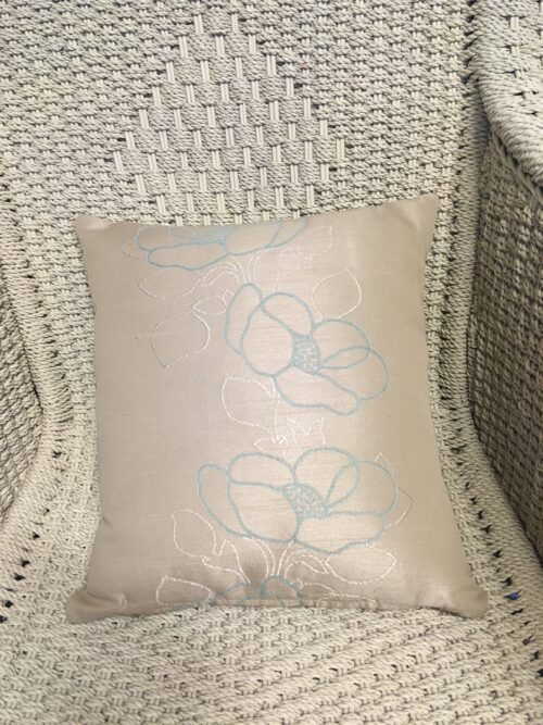 35cm x 40cm scatter cushion cover with zipper opening in bottom seam of cushion. Polyester blend fabric with light gold and turquoise floral design on one side of cushion and co-ordinating metallic gold & turquoise fleck fabric on the other side.