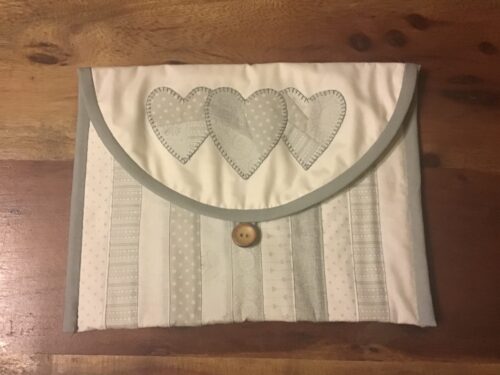 Handmade by Jacaranda Country Cottage. Quilted vertical strips with three appliqued crazy patchwork hearts. Designed to fit iPad 24cm x 17cm x 0.7cm. Fully washable.
