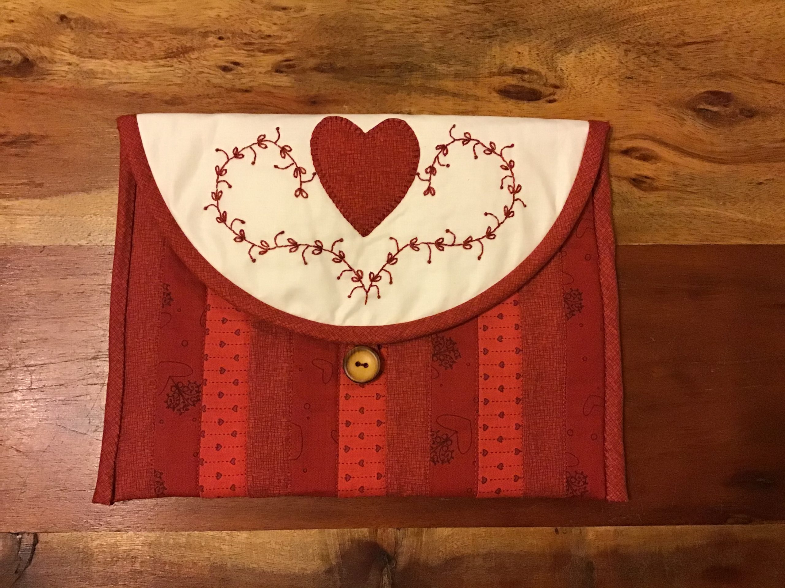 Handmade by Jacaranda Country Cottage. Quilted vertical strips with embroidered wreath and appliqued heart in red tones. Designed to fit iPad 24cm x 17cm x 0.7cm. Fully washable.