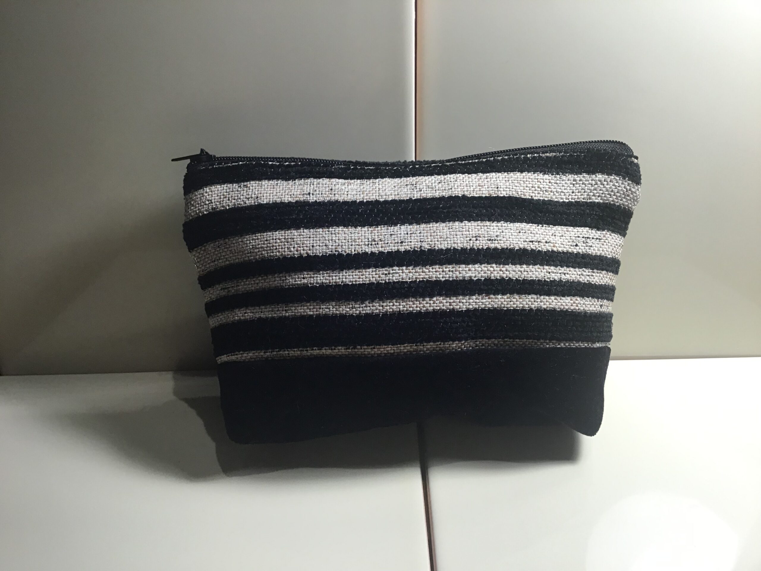 Large size cosmetic bags. Grey fabric with black velvet horizontal stripes at top with co-ordinating plain black velvet fabric for base. Zipper opening at top. 11cm high, 17cm wide at top and 13cm wide at bottom. Great for neatly storing makeup in a large size handbag or for storing creative supplies like crochet hooks or sewing supplies. Fully washable.