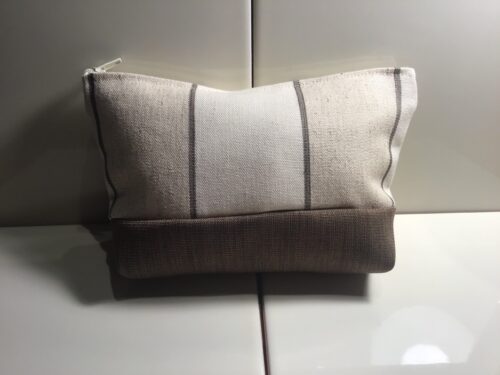 Large size cosmetic bags. Linen coloured fabric with brown vertical stripes at top with co-ordinating plain brown fabric for base. Zipper opening at top. 11cm high, 17cm wide at top and 13cm wide at bottom. Great for neatly storing makeup in a large size handbag or for storing creative supplies like crochet hooks or sewing supplies. Fully washable.