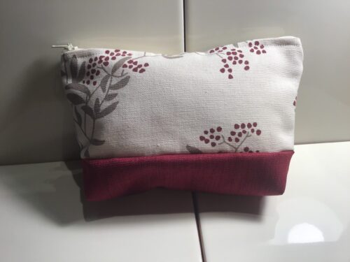 Large size cosmetic bags. Cream fabric with burgundy and taupe floral design at top with co-ordinating plain burgundy fabric for base. Zipper opening at top. 11cm high, 17cm wide at top and 13cm wide at bottom. Great for neatly storing makeup in a large size handbag or for storing creative supplies like crochet hooks or sewing supplies. Fully washable.