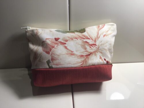 Large size cosmetic bags. Large rust colour floral fabric at top with co-ordinating plain rust colour fabric for base. Zipper opening at top. 11cm high, 17cm wide at top and 13cm wide at bottom. Great for neatly storing makeup in a large size handbag or for storing creative supplies like crochet hooks or sewing supplies. Fully washable.