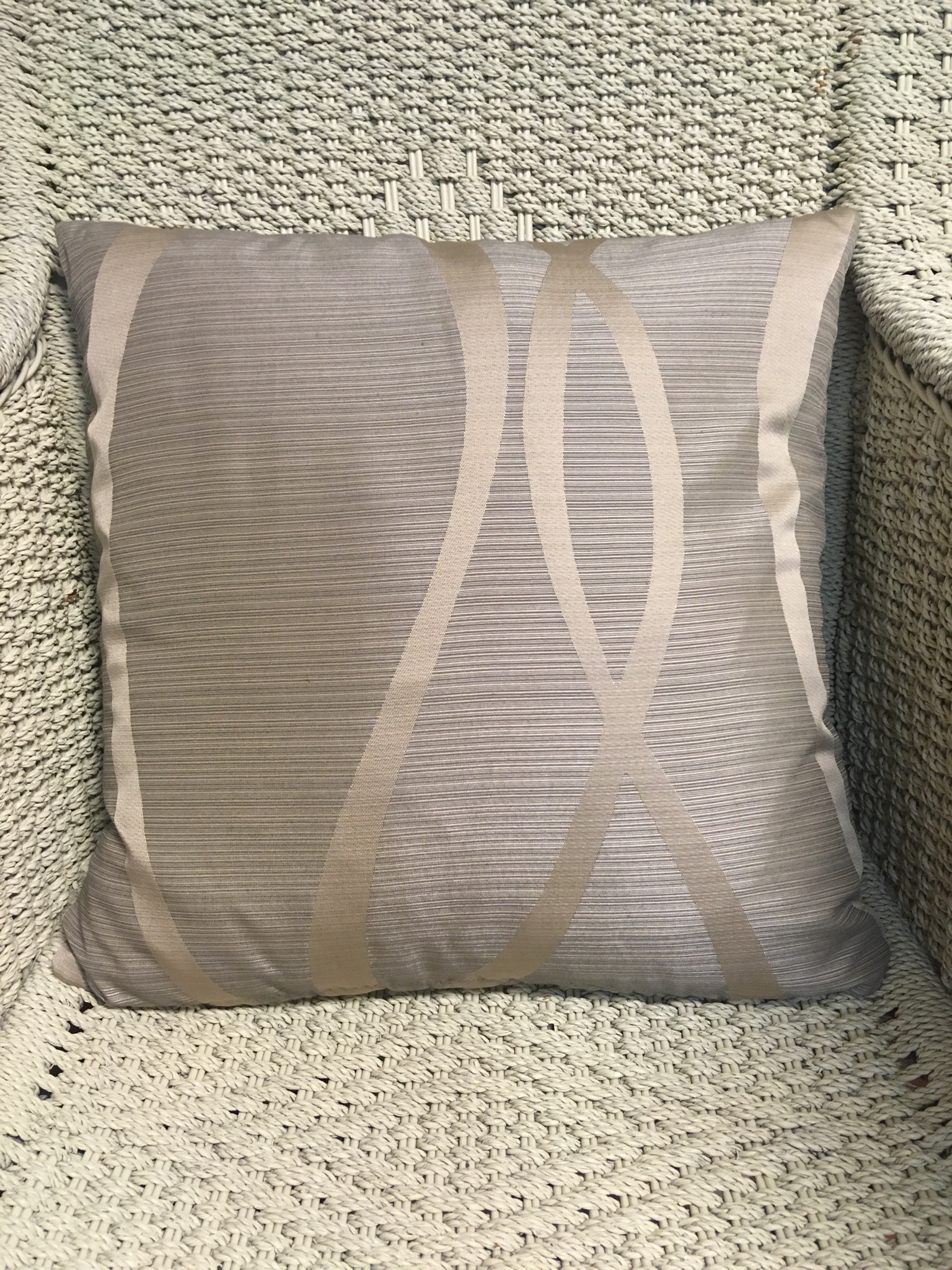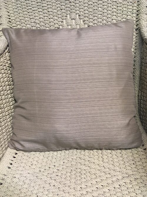 45cm x 45cm scatter cushion cover with zipper opening in bottom seam of cushion. Polyester blend fabric with latte & gold fine horizontal striped background and gold vertical waves on one side with co-ordinating latte & gold fine horizontal striped design only on the other side.