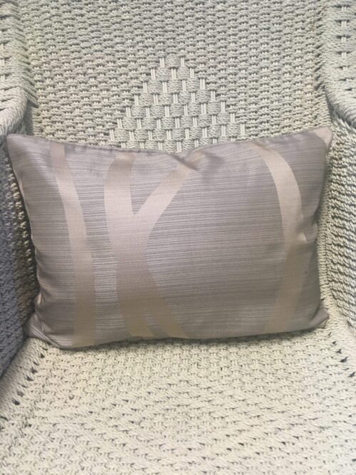 45cm x 35cm scatter cushion cover with zipper opening in bottom seam of cushion. Polyester blend fabric with latte and gold fine horizontal striped background with gold vertical waves on one side of cushion and latte and gold fine horizontal striped design only on the other side.