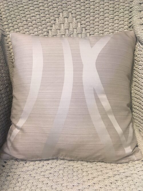 45cm x 45cm scatter cushion cover with zipper opening in bottom seam of cushion. Fabric background has narrow latte vertical stripes with off white wavy horizontal stripes.