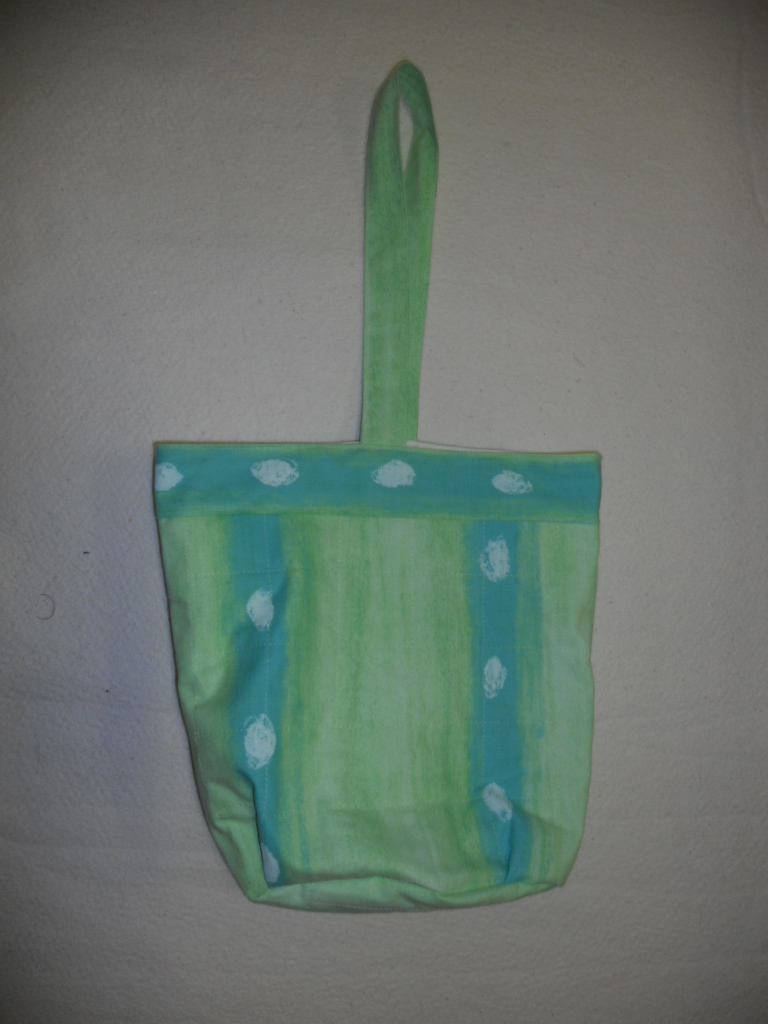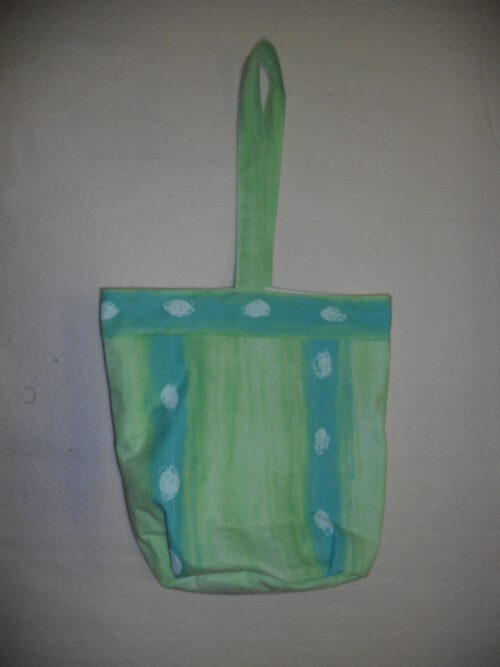 Small tote bag. 30cm x 27cm with single handle. Lime green & aqua stripes with white spots. Machine quilted for strength & durability. Fully machine washable.