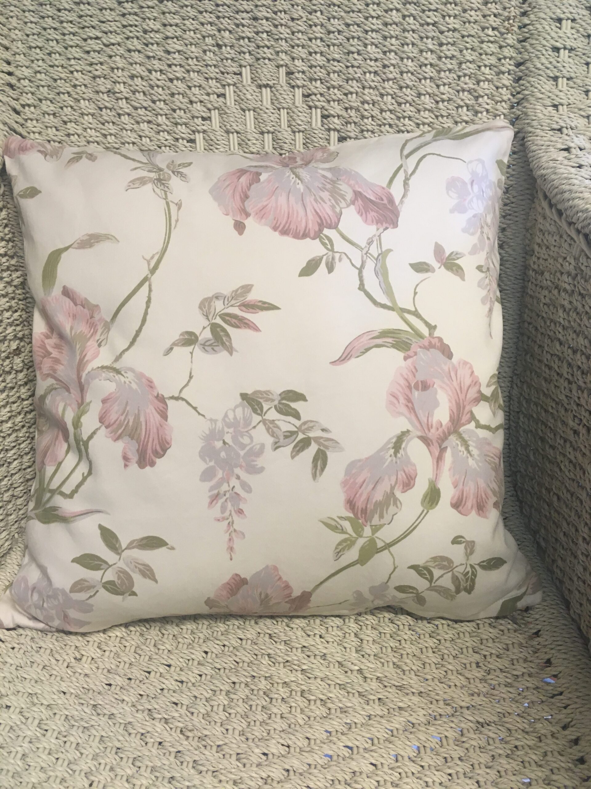 45cm x 45cm scatter cushion cover with zipper opening in bottom seam of cushion. Cotton fabric with off white background and pink & mauve floral design.