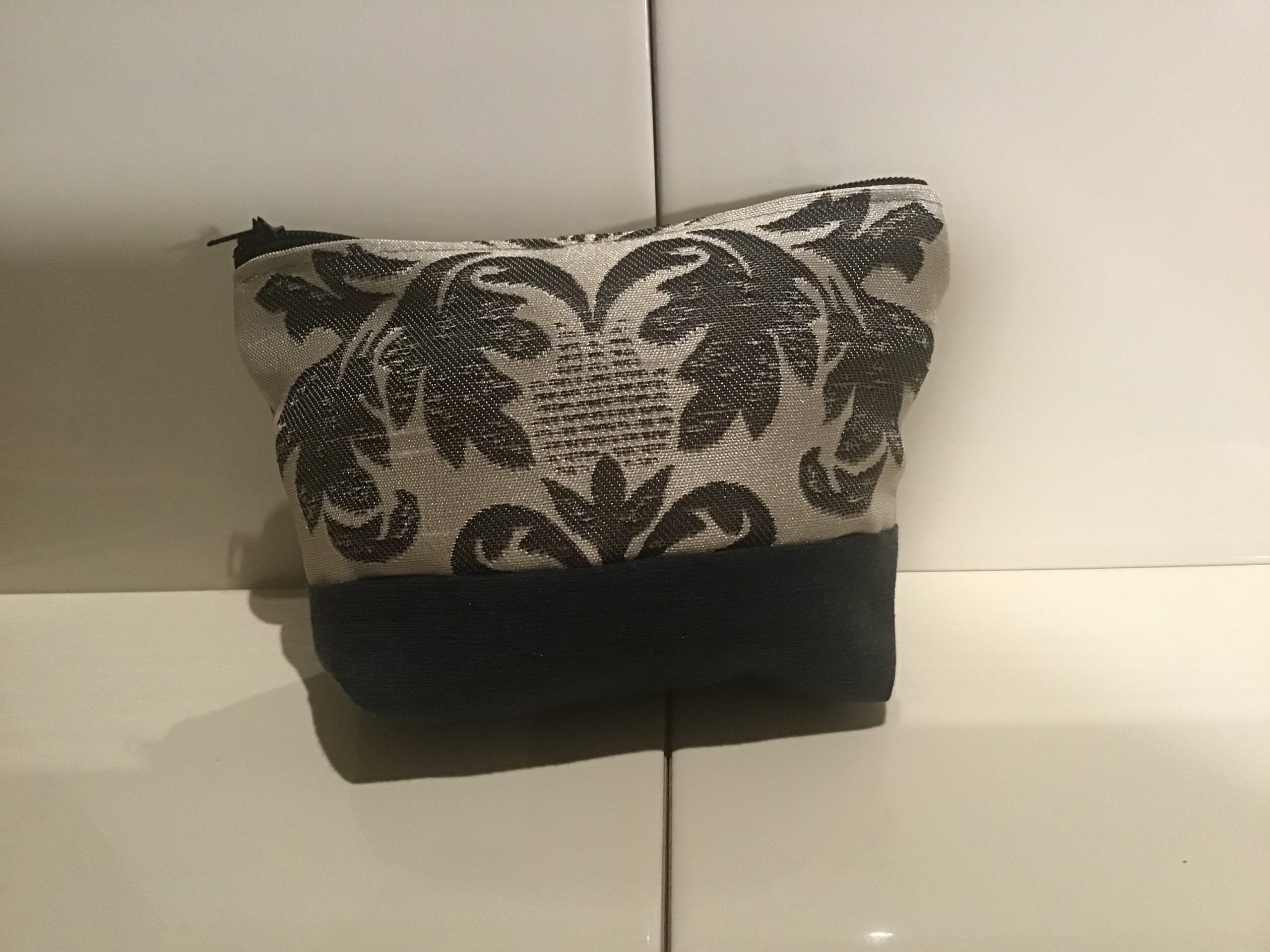 Medium size cosmetic bags. Silver polyester fabricĀ with charcoal scroll design at top with co-ordinating plain charcoal polyester fabric for base. Zipper opening at top. 10cm high, 15cm wide at top and 12cm wide at bottom. Great for neatly storing makeup in a medium size handbag or for storing creative supplies or sewing supplies. Fully washable.