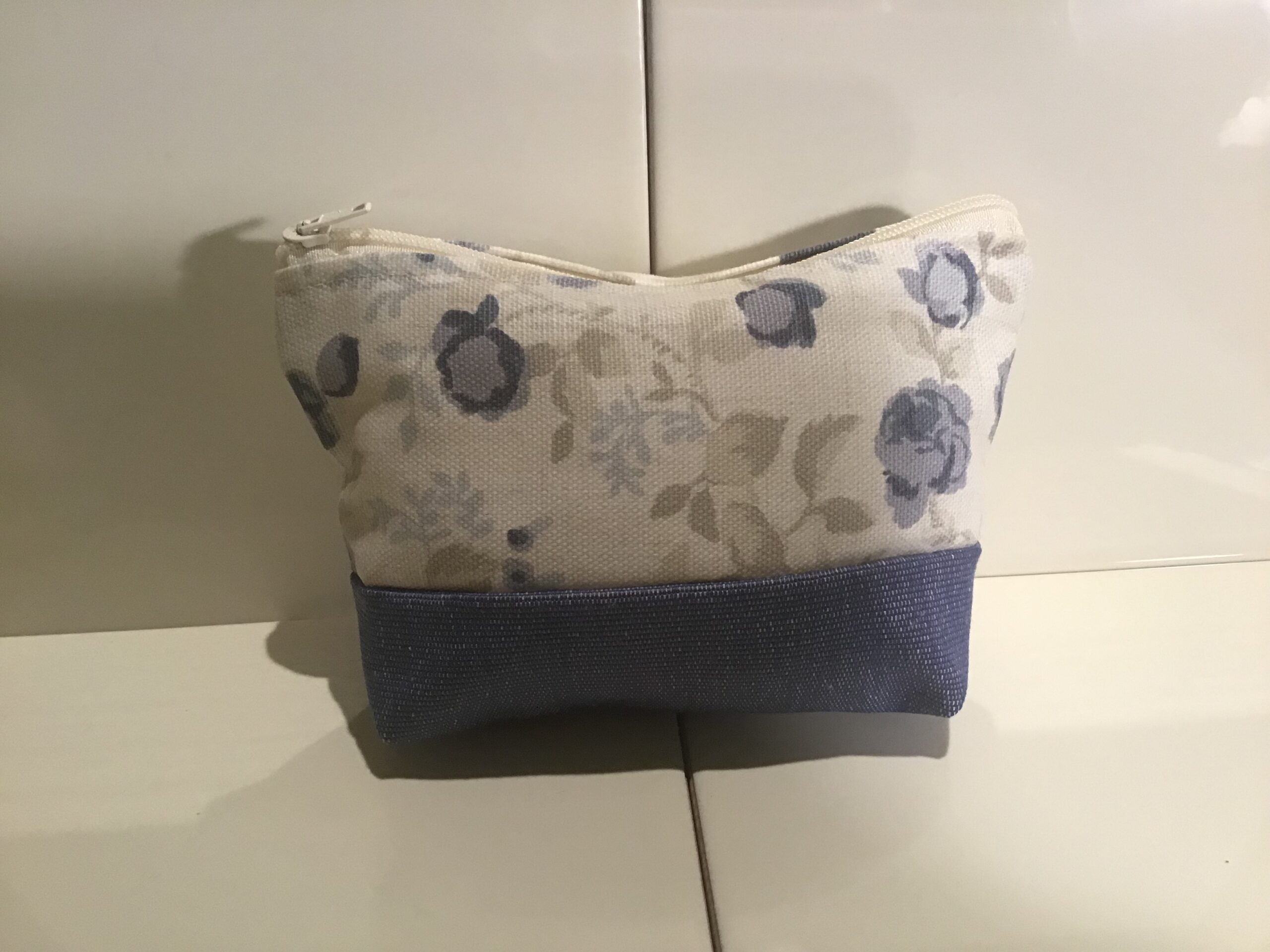Medium size cosmetic bags. Small blue floral fabric at top with co-ordinating plain blue cotton fabric for base. Zipper opening at top. 10cm high, 15cm wide at top and 12cm wide at bottom. Great for neatly storing makeup in a medium size handbag or for storing creative supplies or sewing supplies. Fully washable.