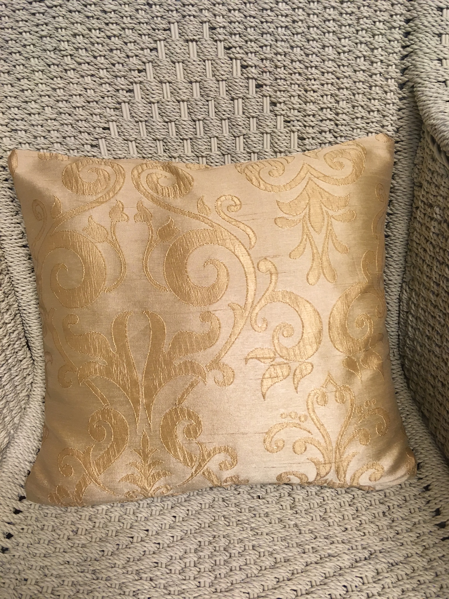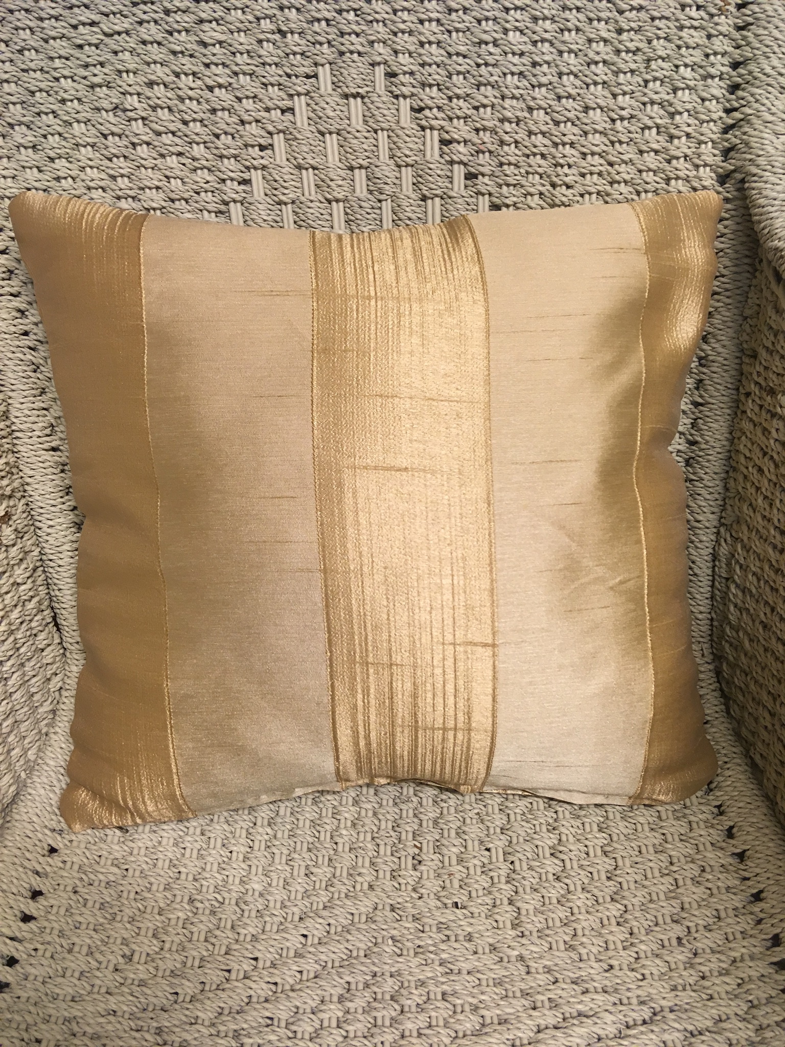 40cm x 40cm scatter cushion cover with zipper opening in bottom seam of cushion. Polyester blend fabric in medium gold with scroll design on one side of cushion with co-ordinating stripe design on other side of cushion.
