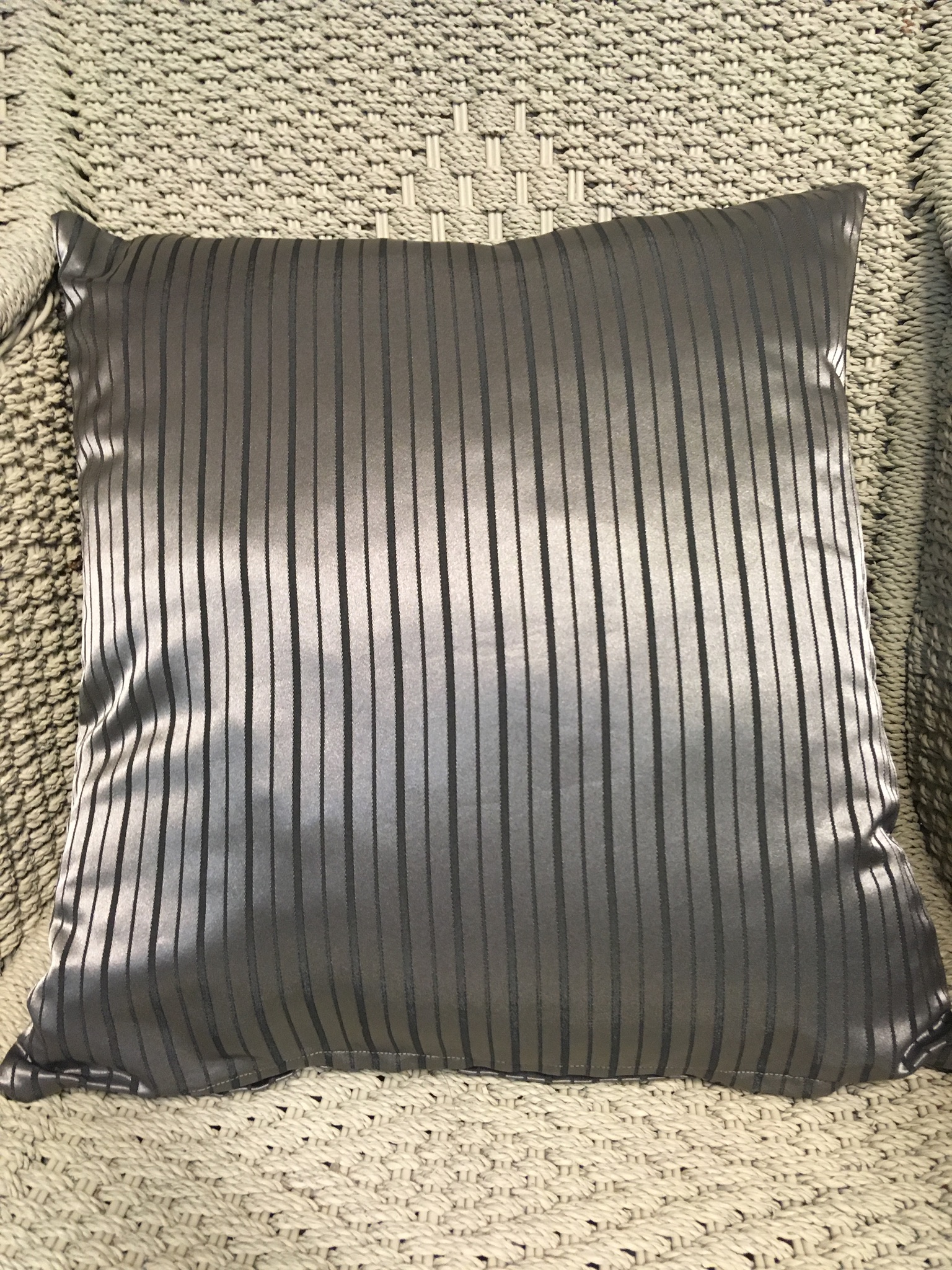 45cm x 45cm scatter cushion cover with zipper opening in bottom seam of cushion. Metallic silver & charcoal fabric with narrow vertical stripes.