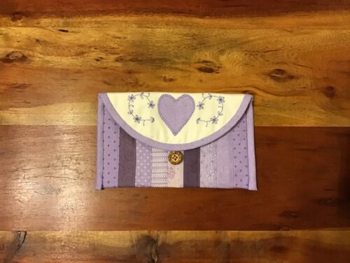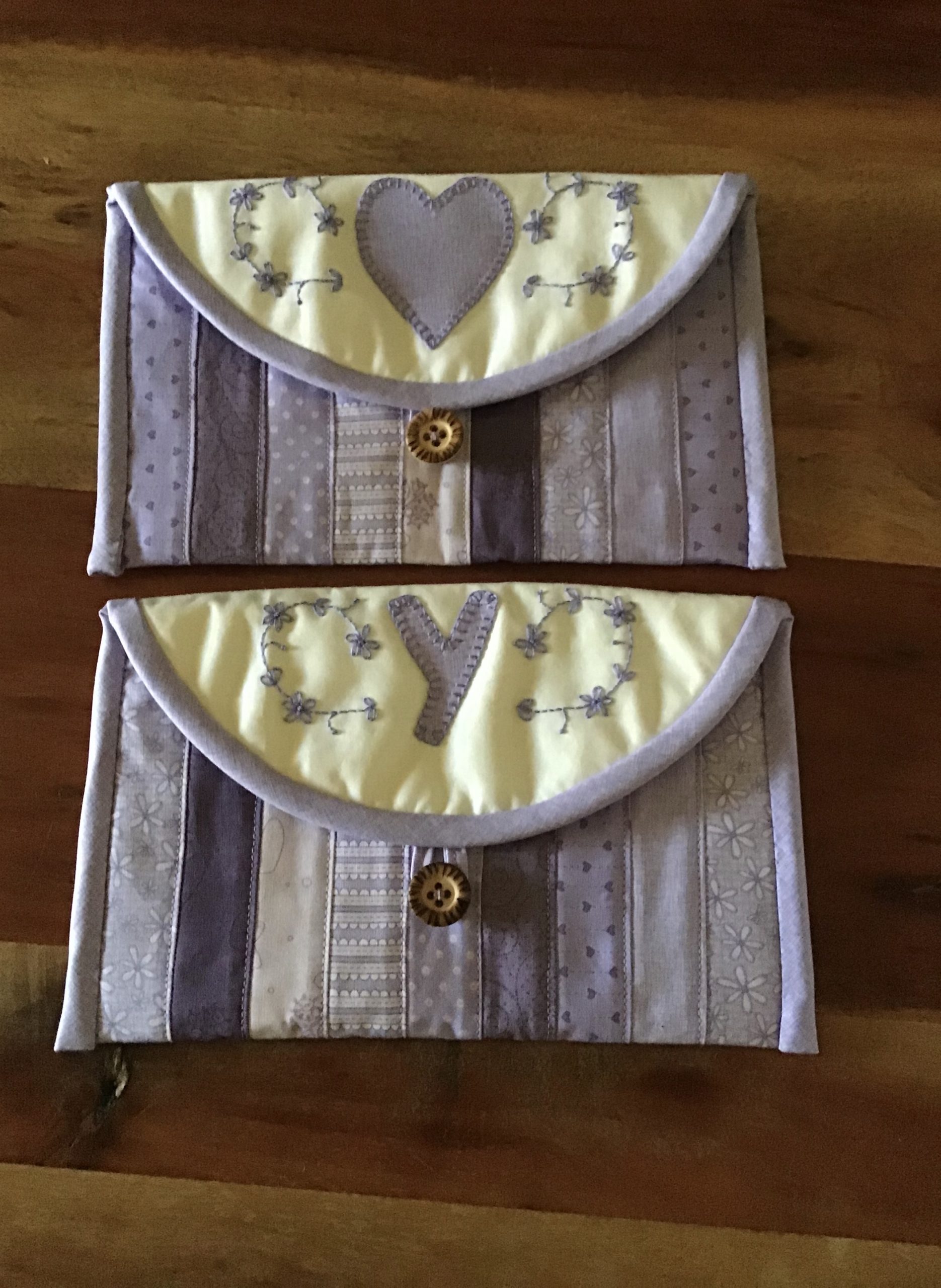 Handmade by Jacaranda Country Cottage. Quilted vertical strips with mauve wreath embroidery and appliqued heart. Designed to fit mini tablet 20cm x 13cm x 1cm. Fully washable. Also available custom made with monogram lettering. (See photo).