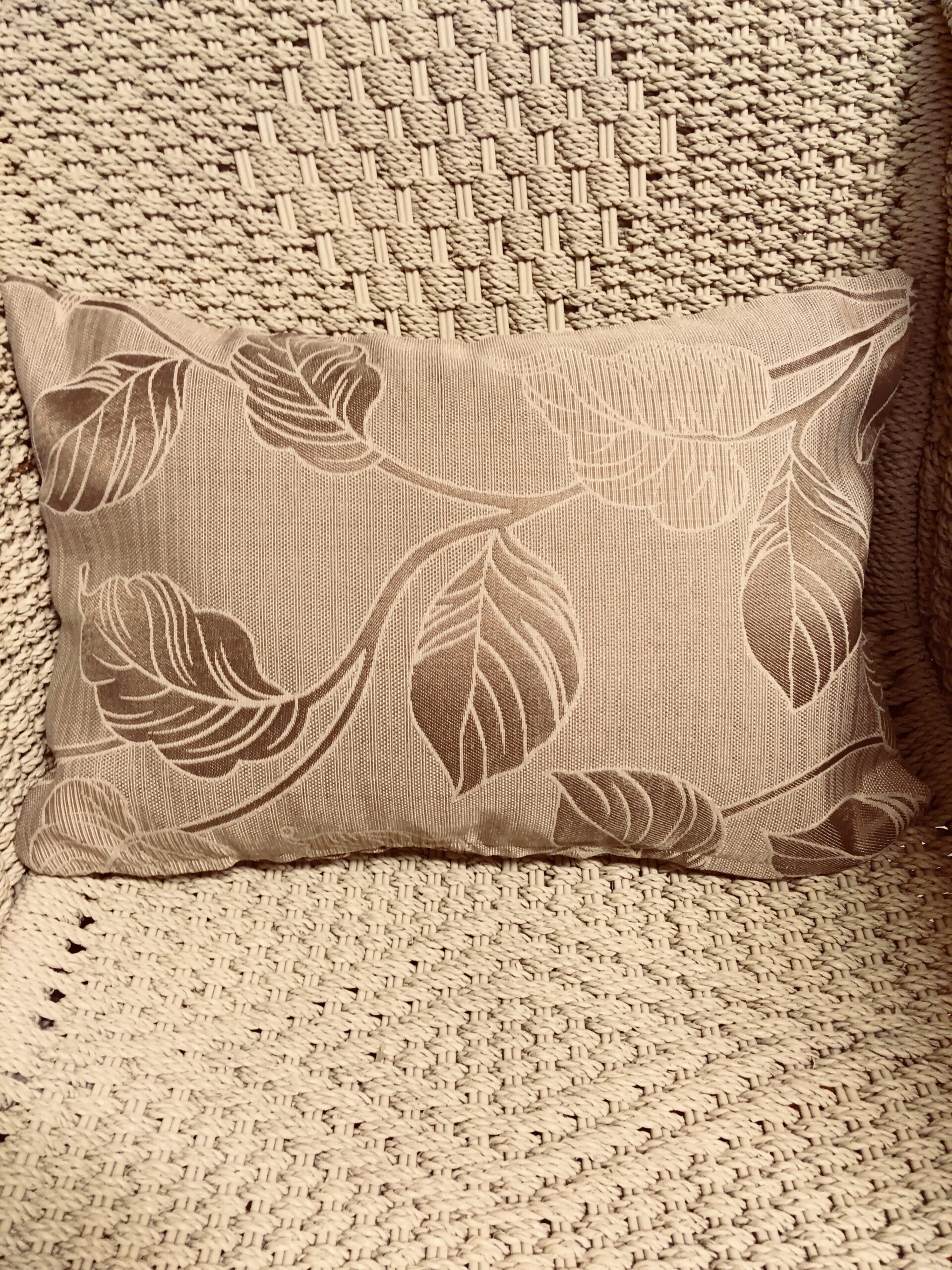 40cm x 30cm scatter cushion cover with zipper opening in bottom seam of cushion. Mocha leaf self print design.