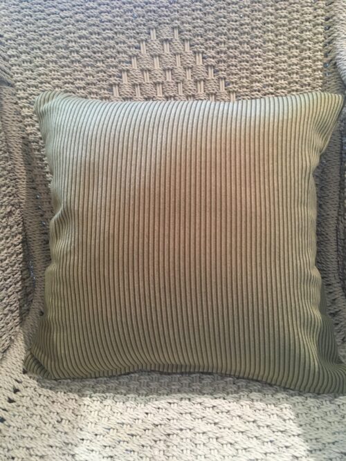 40cm x 40cm scatter cushion cover with zipper opening in bottom seam of cushion. Velvet fabric with narrow multi-tone green vertical stripes. Light weight upholstery fabric.