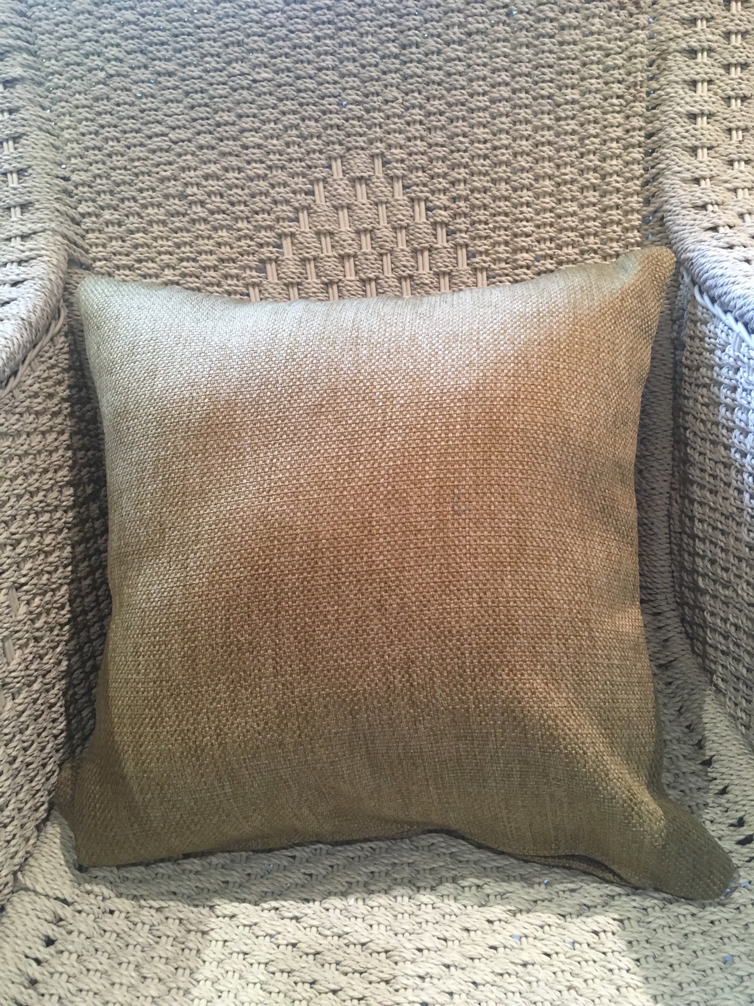 45cm x 45cm scatter cushion cover with zipper opening in bottom seam of cushion. Olive green fabric with chunky open weave texture. Upholstery weight fabric.