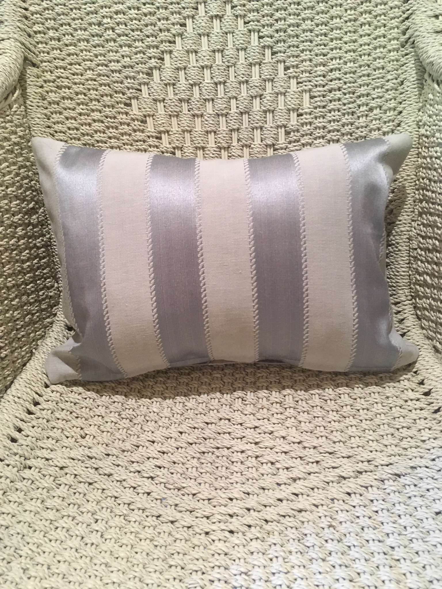 40cm x 30cm scatter cushion cover with zipper opening in bottom seam of cushion. Pale blue fabric with medium width vertical stripe self print design.
