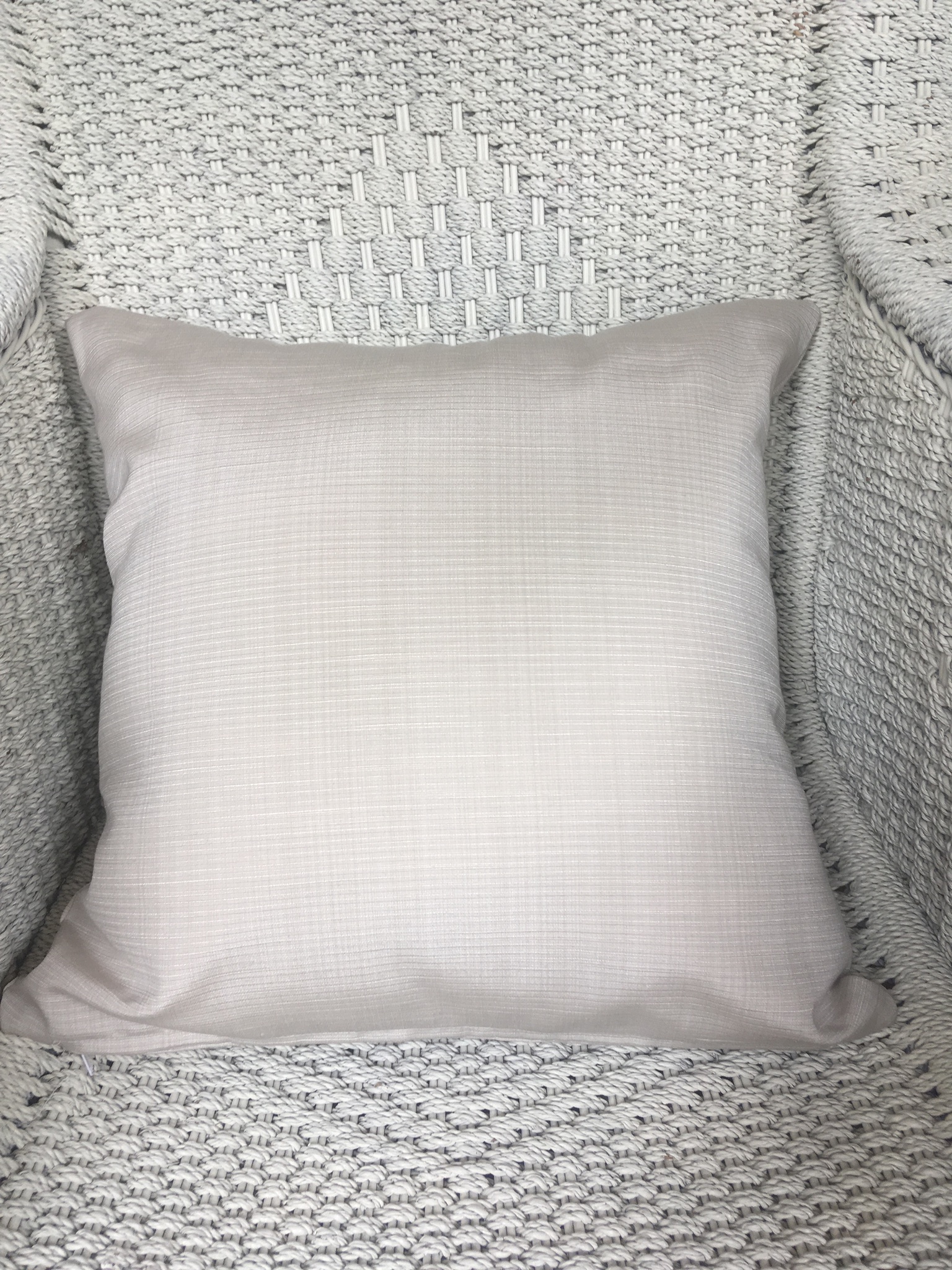 45cm x 45cm scatter cushion cover with zipper opening in bottom seam of cushion. Polyester blend fabric in pale latte colour with a ribbed horizontal texture.