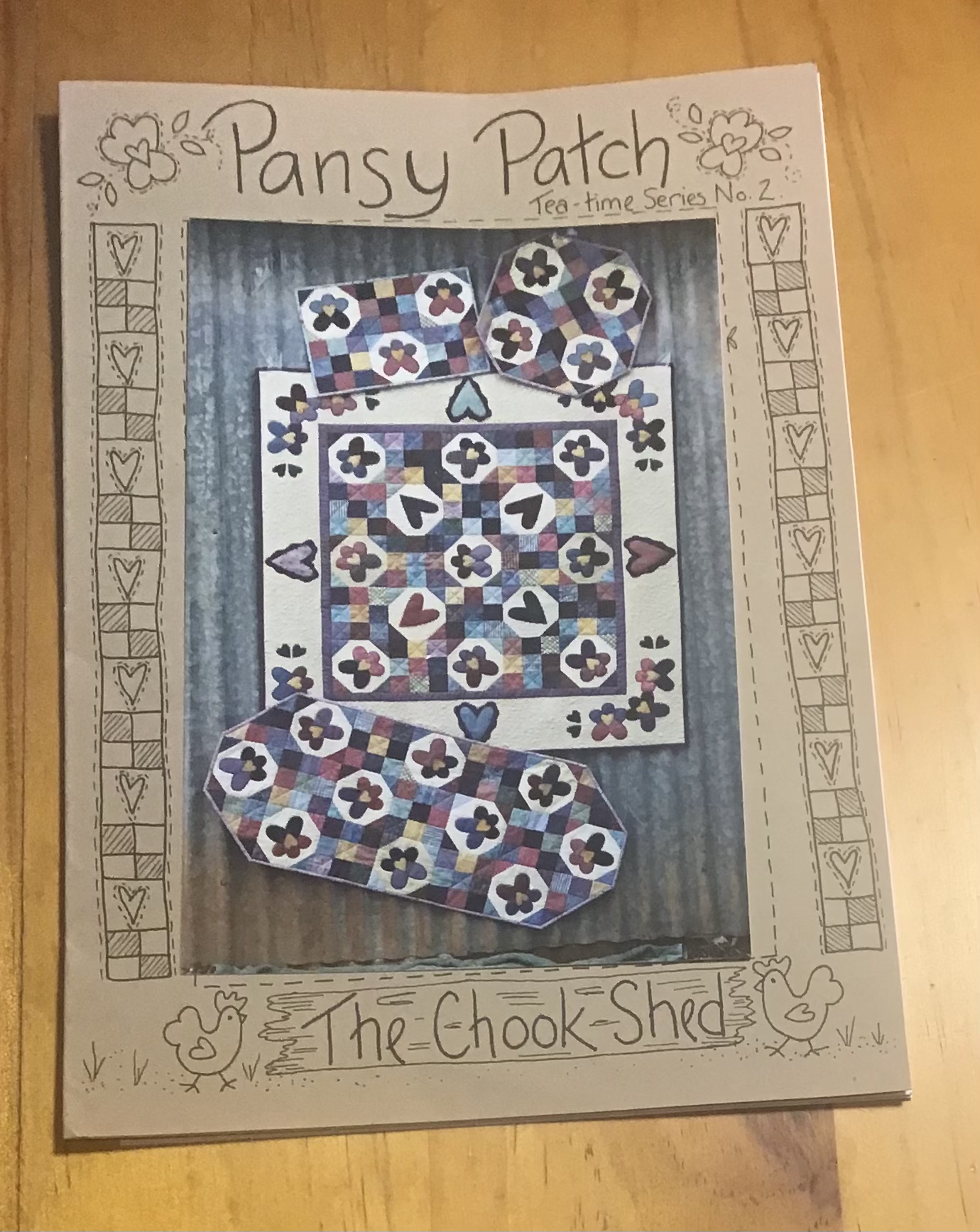 Patchwork and appliqué pattern. Designed by The Chook Shed. Pattern includes table throw (112cm x 112cm), table runner (107cm x 47cm), octagonal placemat (47cm x 47cm), rectangular placemat (47cm x 31cm).