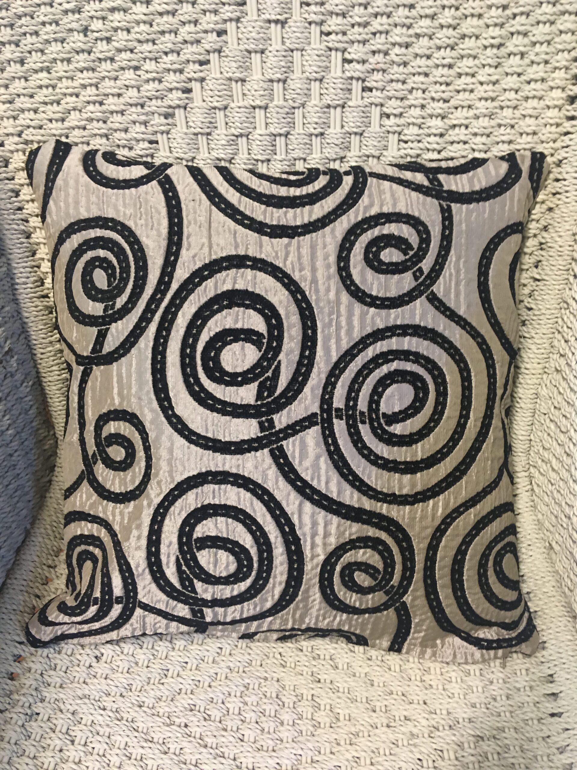 45cm x 45cm scatter cushion cover with zipper opening in bottom seam of cushion. Pewter coloured polyester textured fabric with black velvet scroll design.