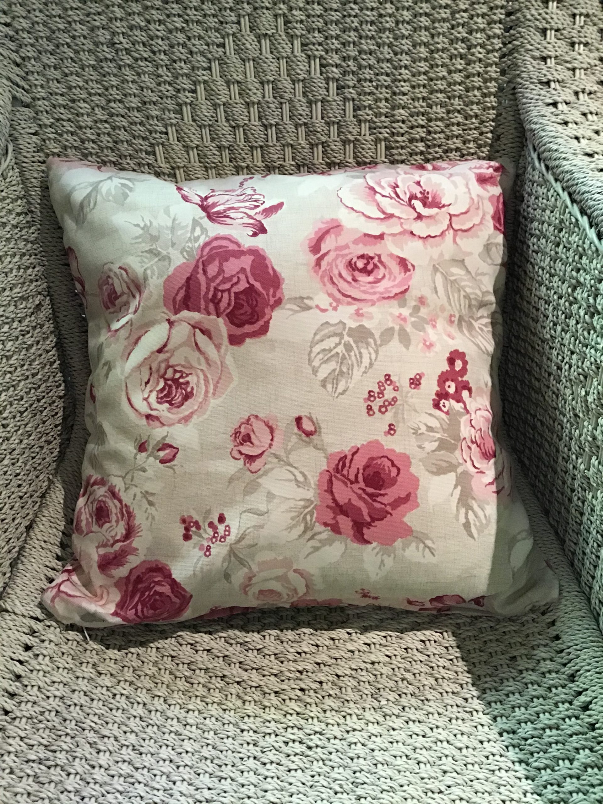 45cm x 45cm scatter cushion cover with zipper opening in bottom seam of cushion. Canvas fabric with linen background and raspberry & mocha large floral design.