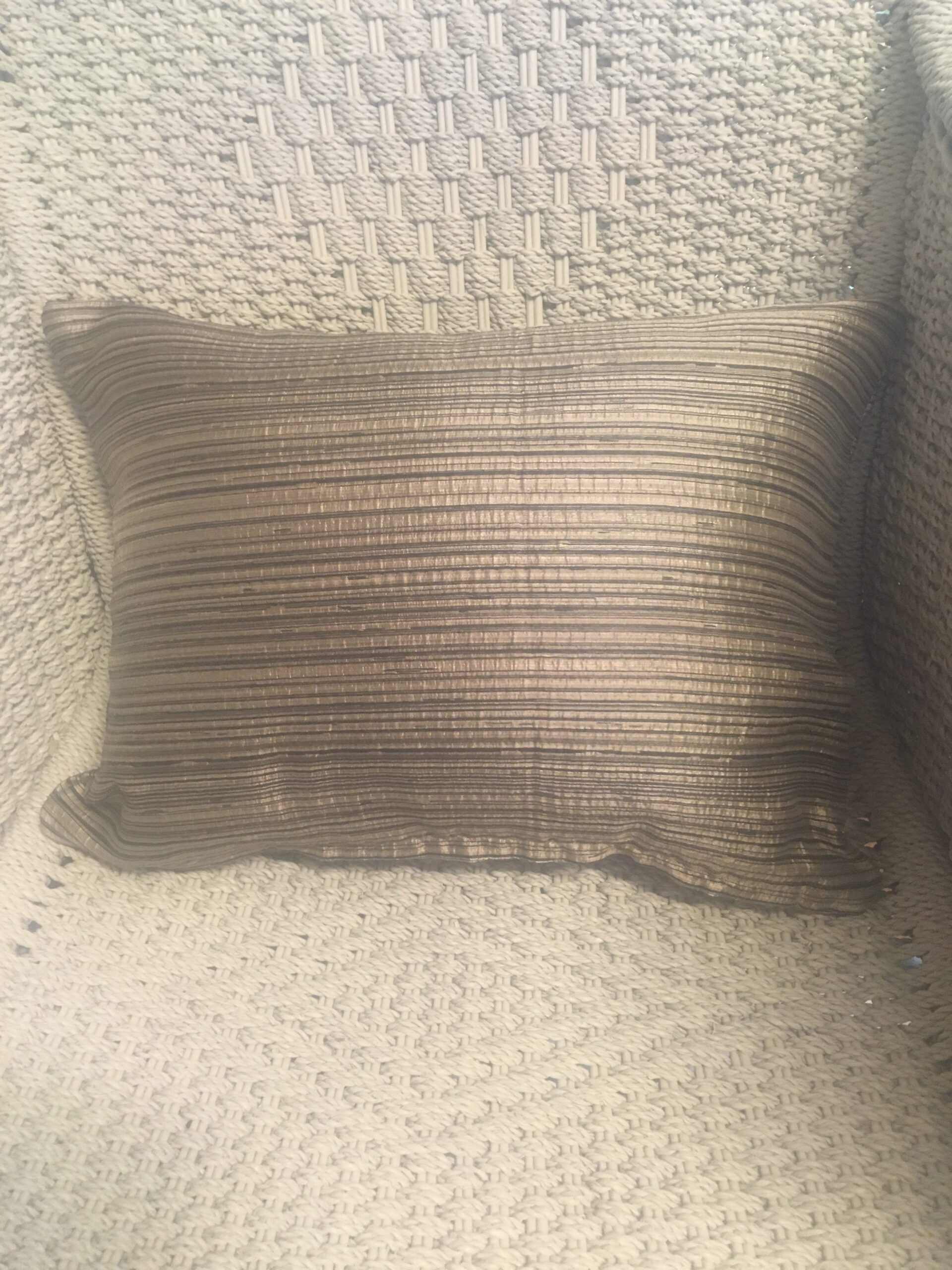 40cm x 30cm scatter cushion cover with zipper opening in bottom seam of cushion. Polyester blend fabric with metallic bronze & charcoal horizontal stripe design.