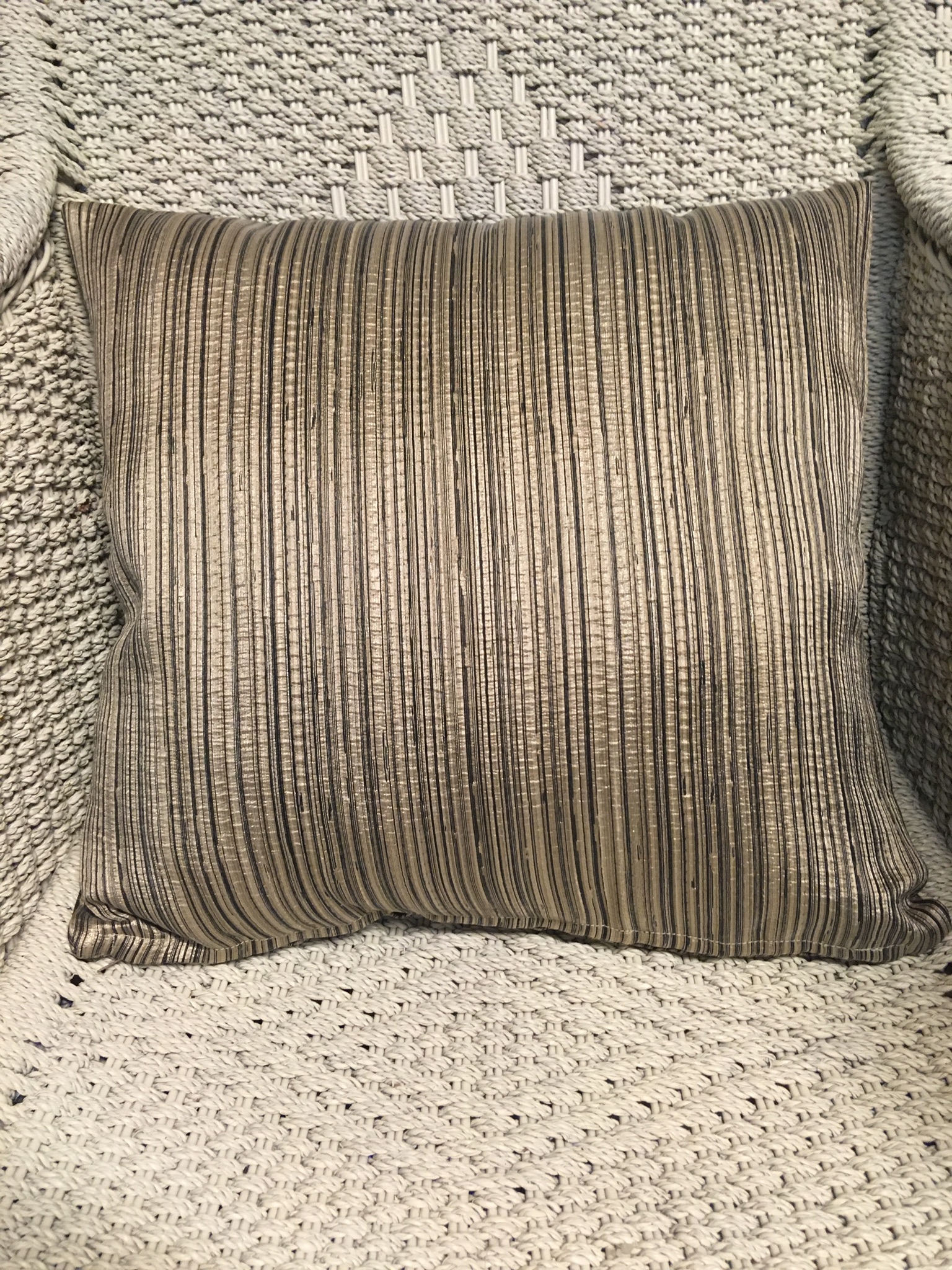 45cm x 45cm scatter cushion cover with zipper opening in bottom seam of cushion. Polyester blend fabric with metallic bronze & charcoal vertical stripes.