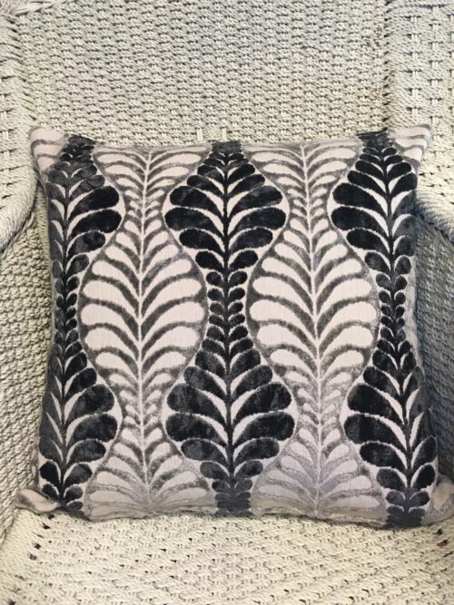 50cm x 50cm scatter cushion cover with zipper in bottom edge of cushion. Silver and charcoal velour leaves on pale beige background on front with co-ordinating plain beige cotton fabric on back. Upholstery weight fabric.