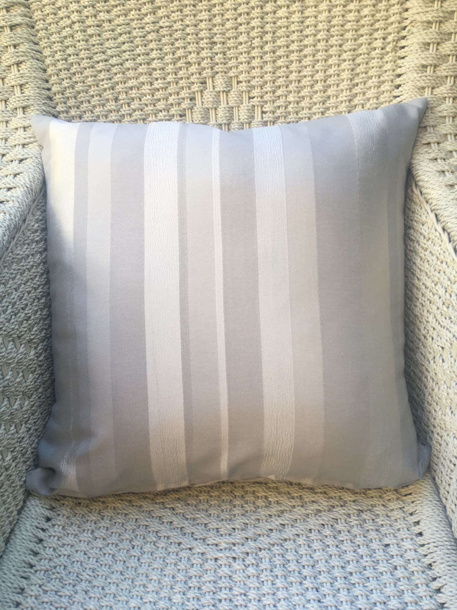 50cm x 50cm scatter cushion cover with zipper opening in bottom seam of cushion. Polyester blend fabric with multi-toned silver vertical stripes.