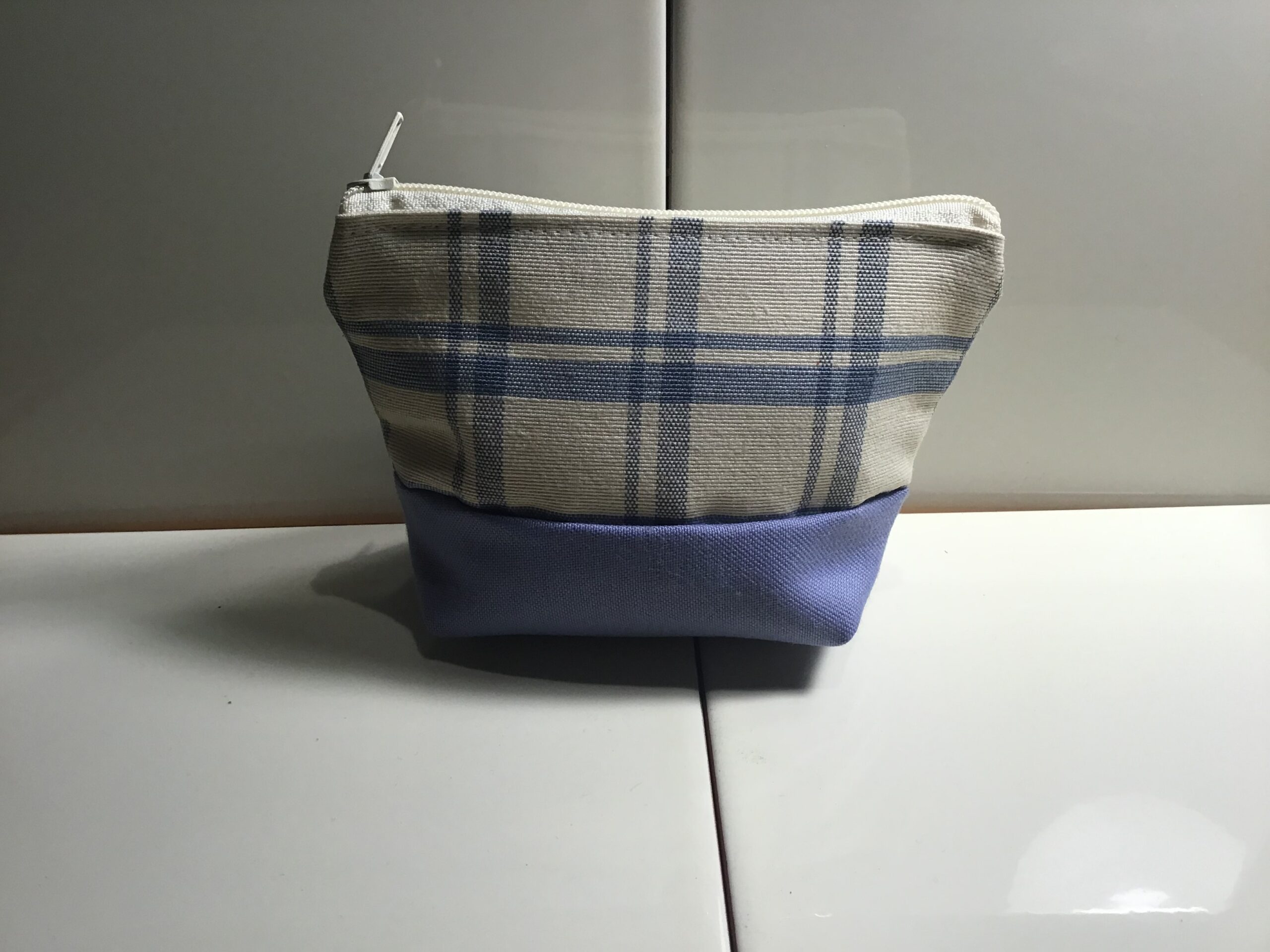 Small size cosmetic bag. Blue plaid design at top with co-ordinating plain blue cotton fabric for base. Zipper opening at top. 9cm high, 13cm wide at top and 9cm wide at bottom. Great for neatly storing touch up makeup in your handbag eg compact, lipstick and lip gloss. Also great as a coin back or to store sewing supplies. Fully washable.
