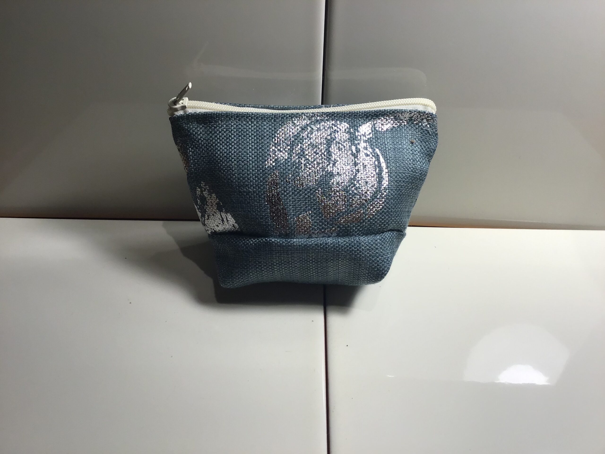 Small size cosmetic bag. Teal Linen fabric with metallic silver print at top with co-ordinating plain teal linen fabric for base. Zipper opening at top. 9cm high, 13cm wide at top and 9cm wide at bottom. Great for neatly storing touch up makeup in your handbag eg compact, lipstick and lip gloss. Also great as a coin back or to store sewing supplies. Fully washable.