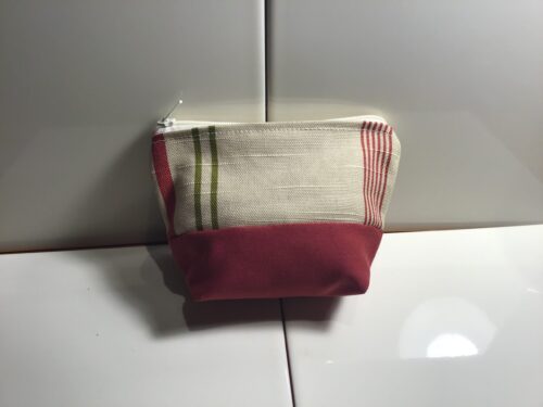 Small size cosmetic bag. Red & green vertical stripe print at top with co-ordinating plain rose red cotton fabric for base. Zipper opening at top. 9cm high, 13cm wide at top and 9cm wide at bottom. Great for neatly storing touch up makeup in your handbag eg compact, lipstick and lip gloss. Also great as a coin back or to store sewing supplies. Fully washable.